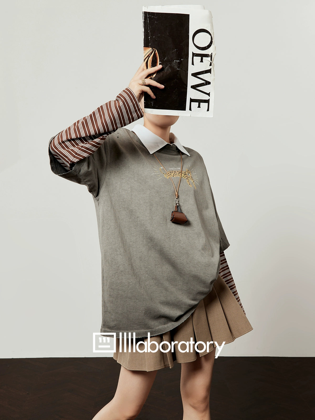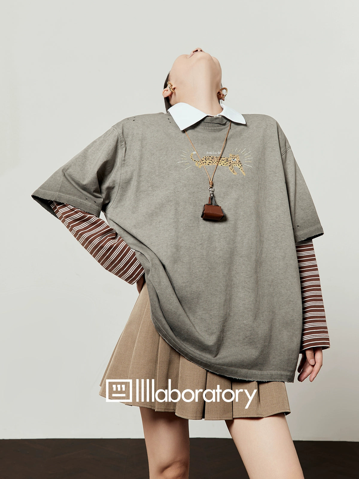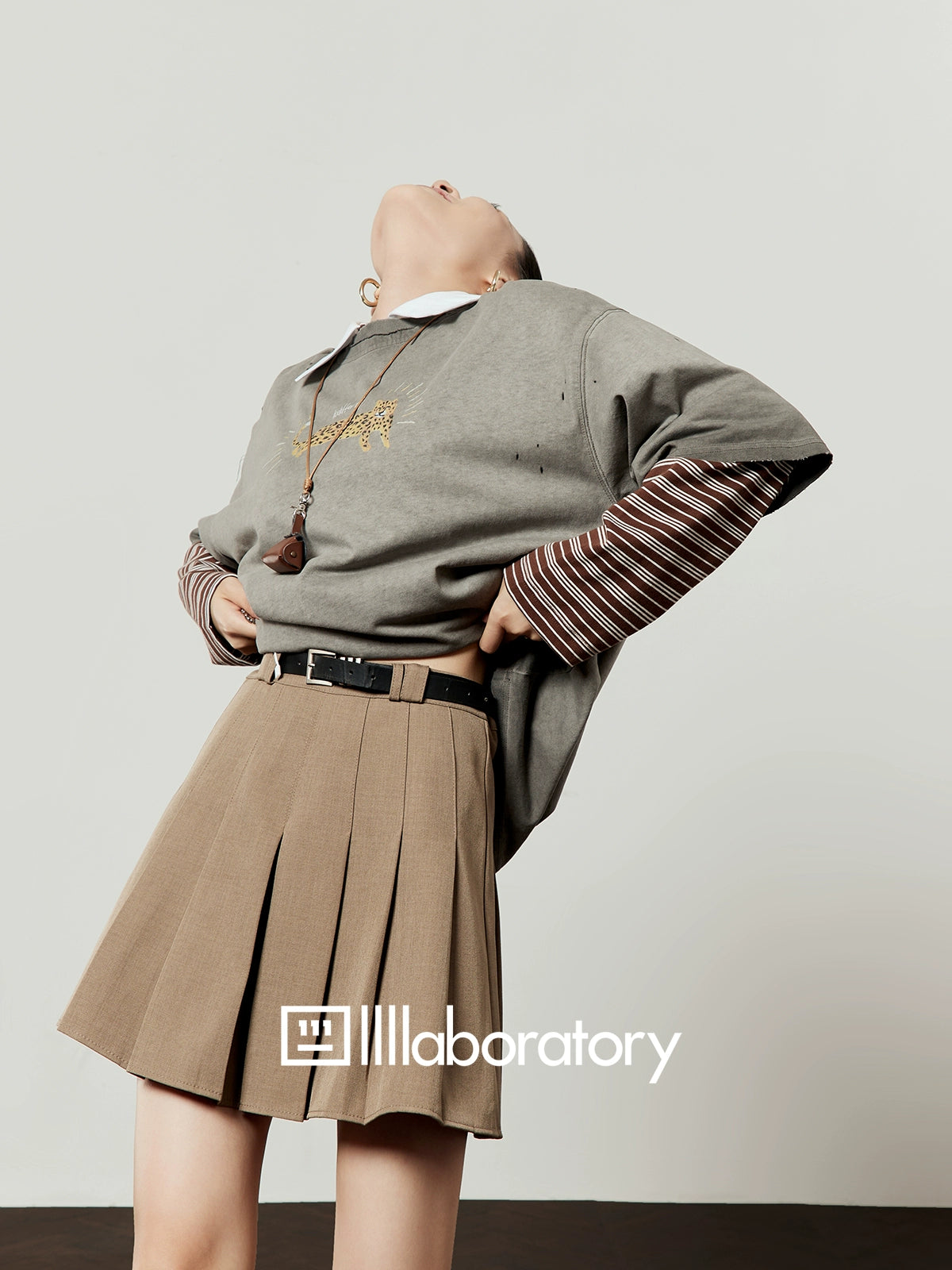 Vintage Gray T-Shirt / Light Brown Pleated Skirt LLA0509