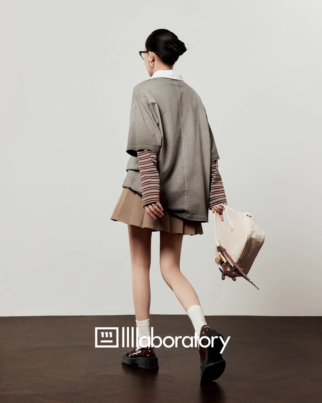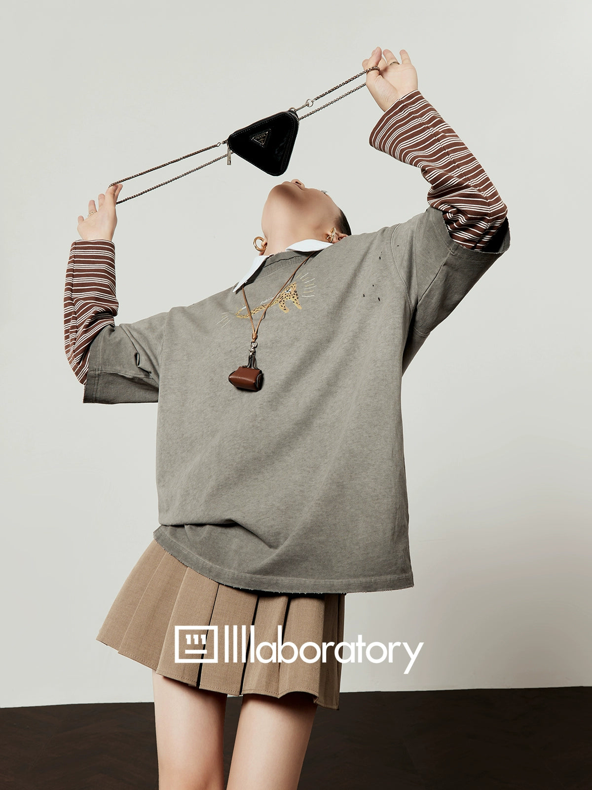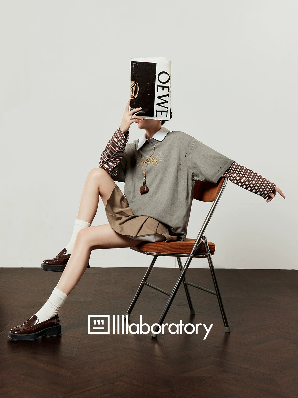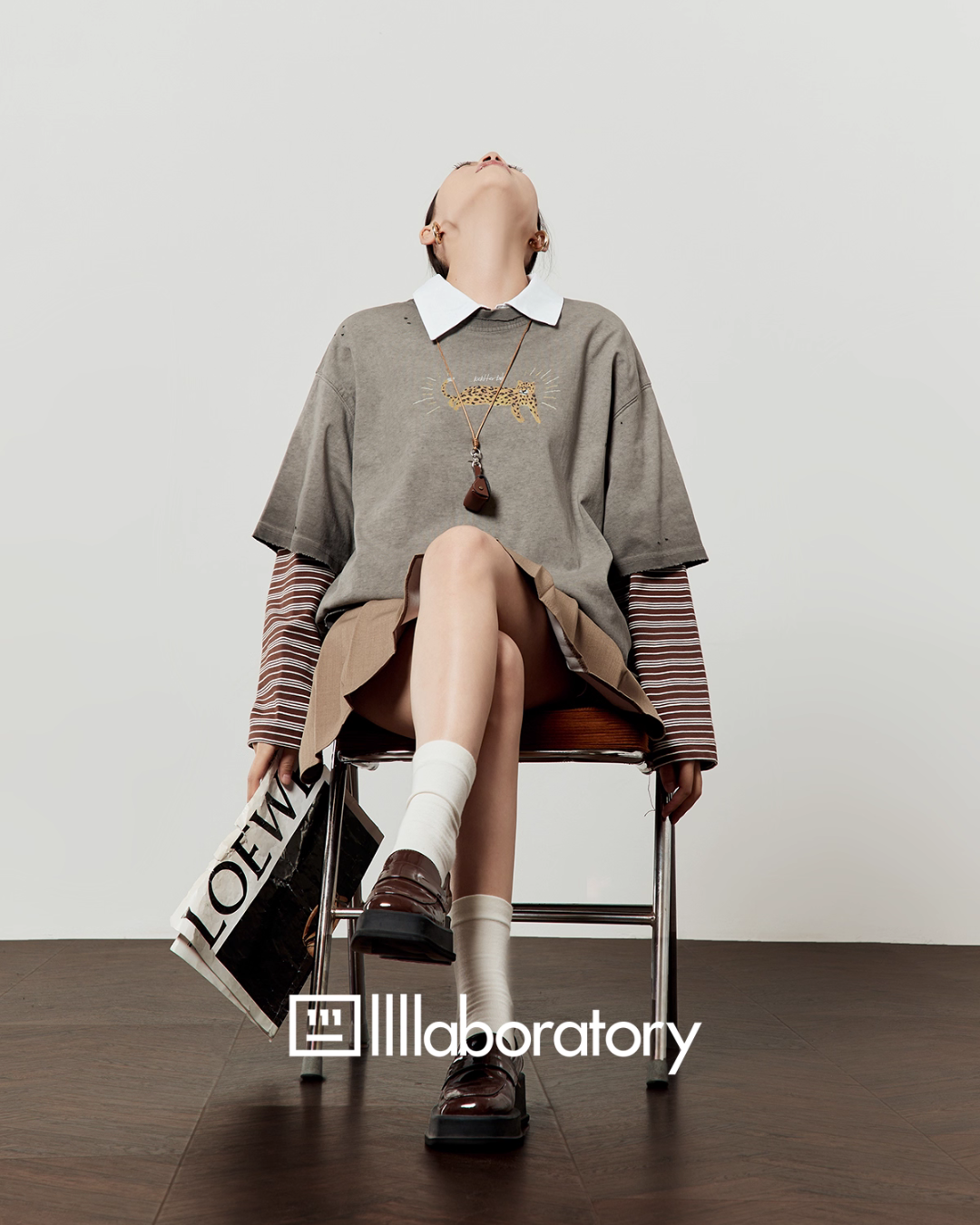 Vintage Gray T-Shirt / Light Brown Pleated Skirt LLA0509