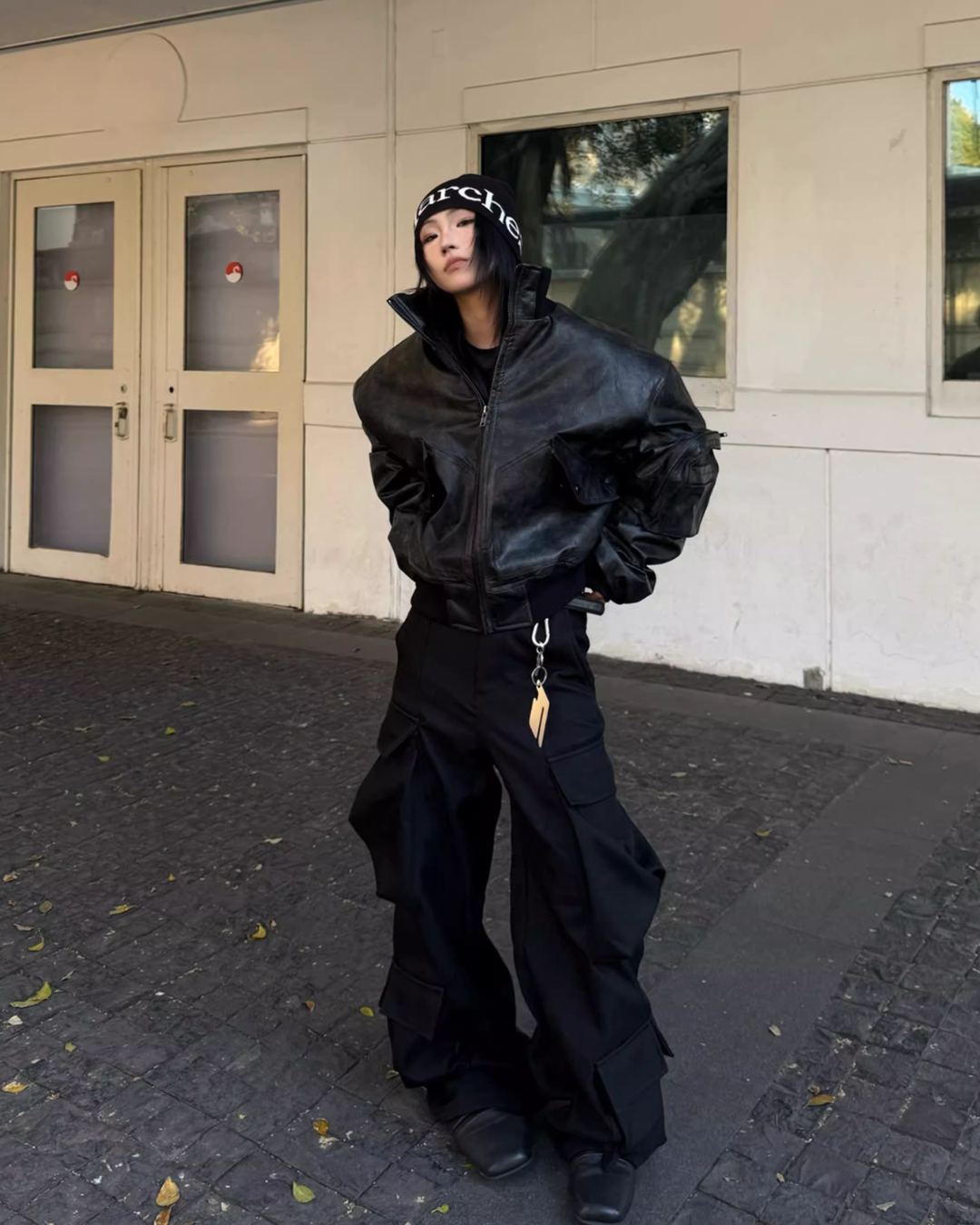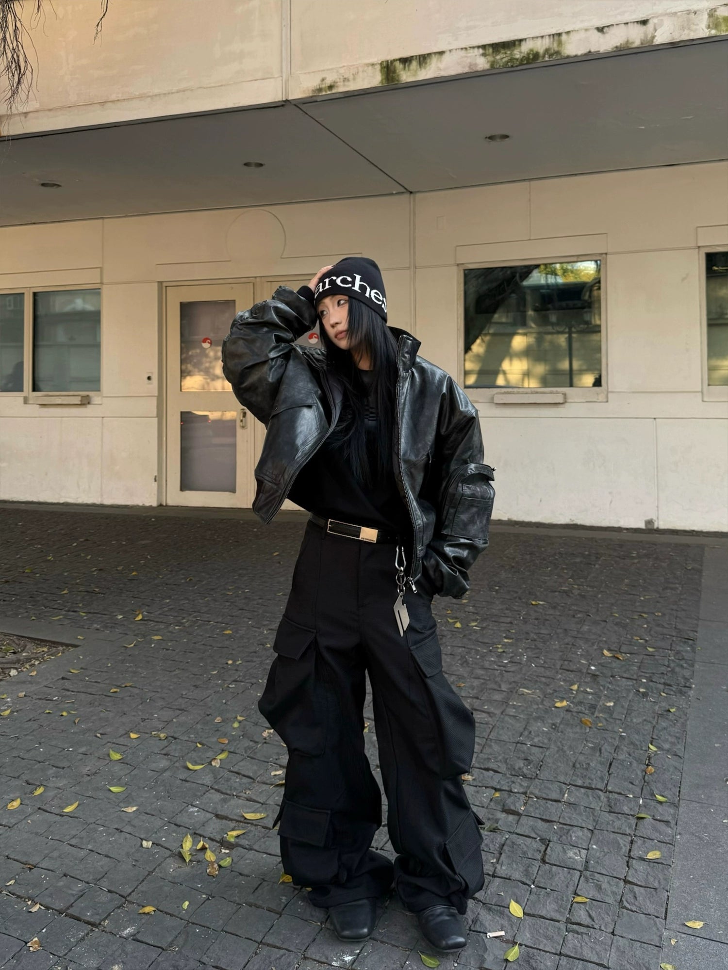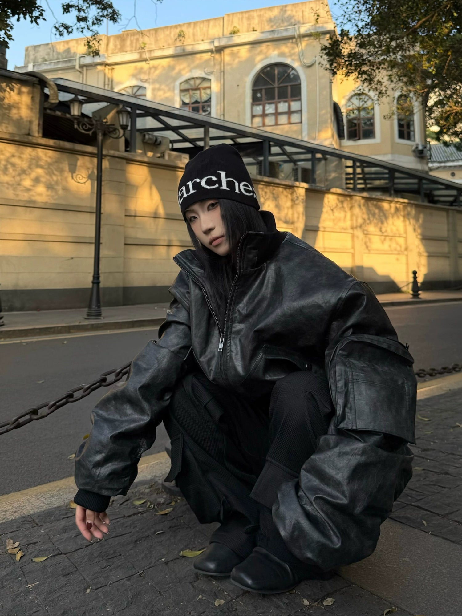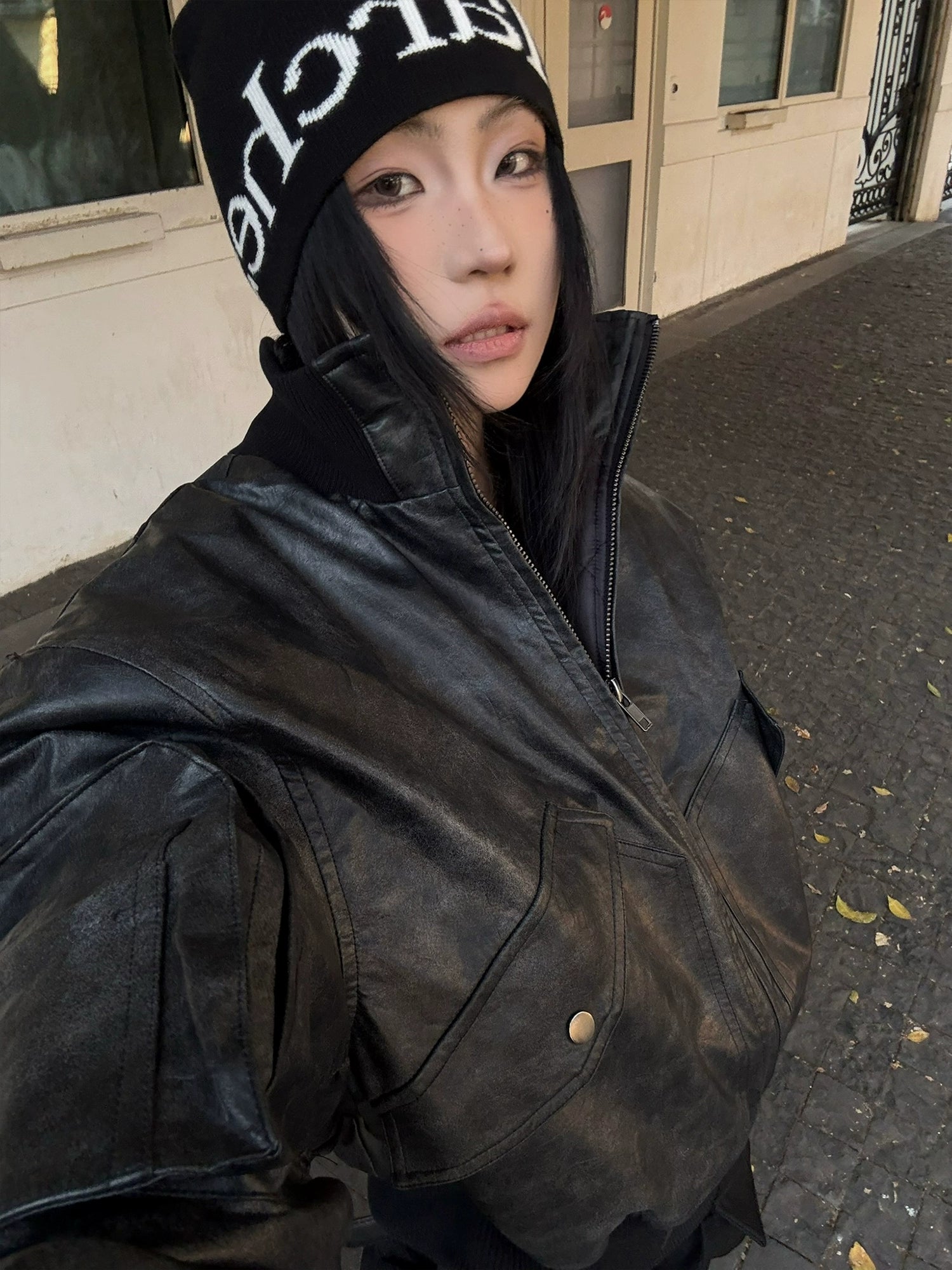 マットな質感と程よい厚みのフェイクレザー素材で、古着ライクな雰囲気を演出。