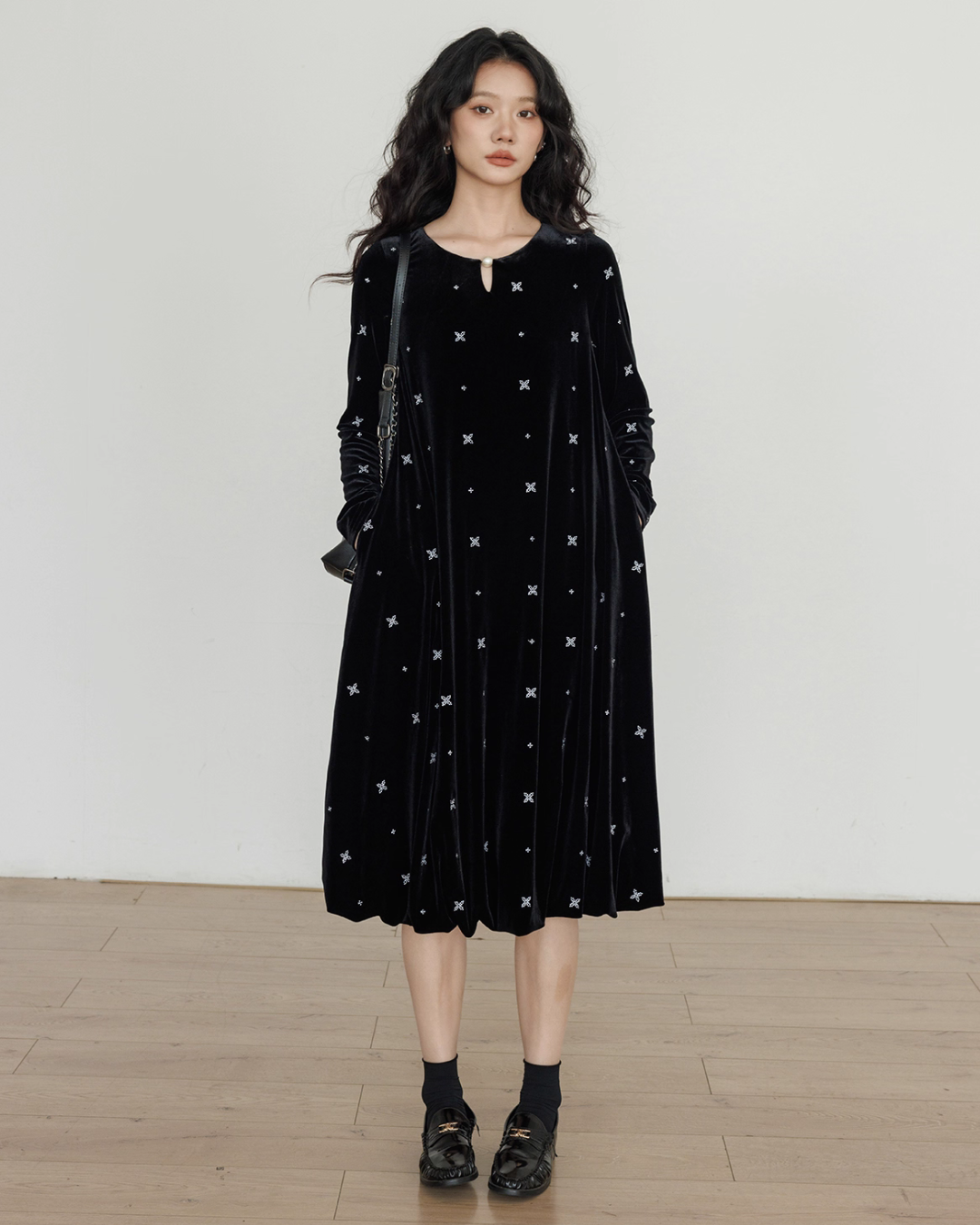 上品で重厚感のあるベロア素材で仕立てたロングワンピース。