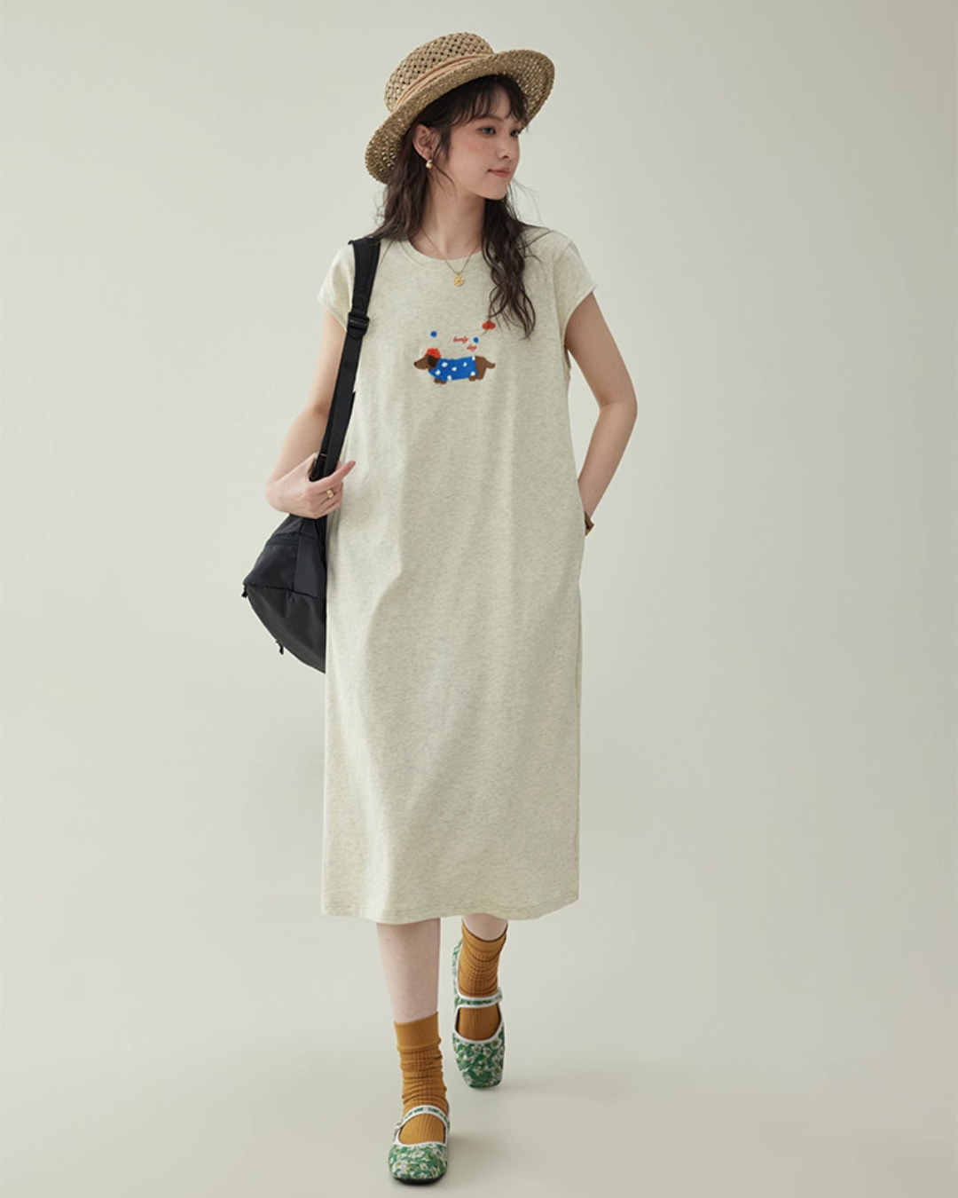 キュートな犬の立体的な刺繍が施されたTシャツワンピース。