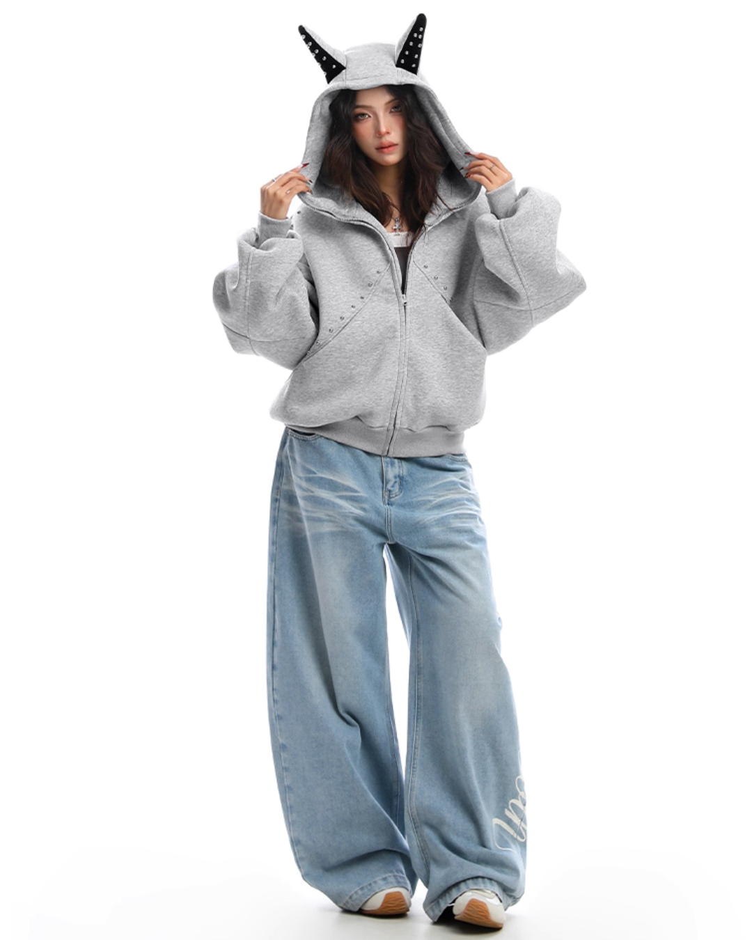 猫耳がチャームポイントの着るだけでぐっと目を惹くジップパーカー。