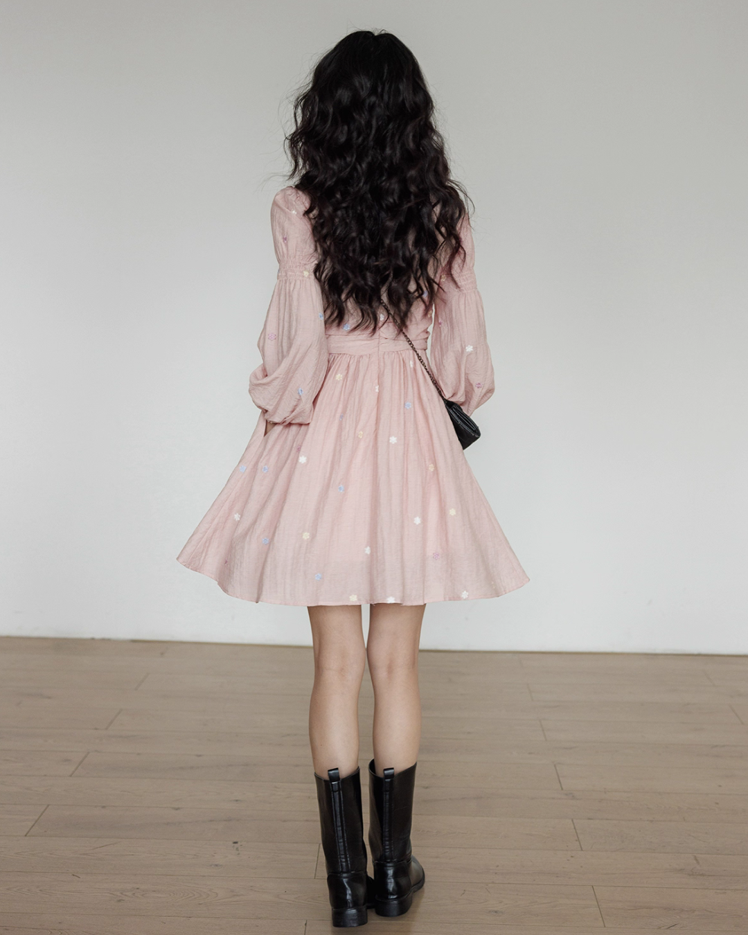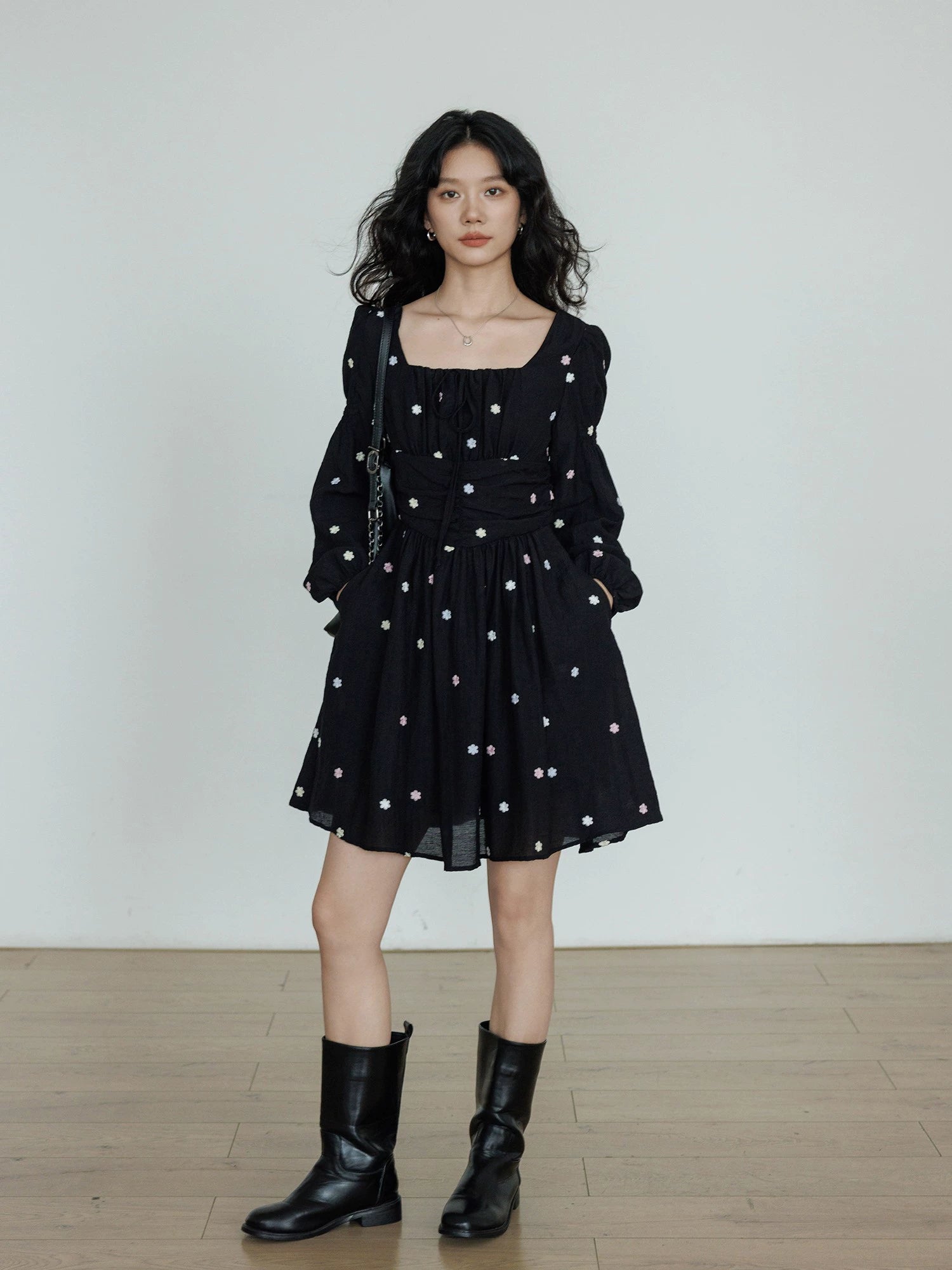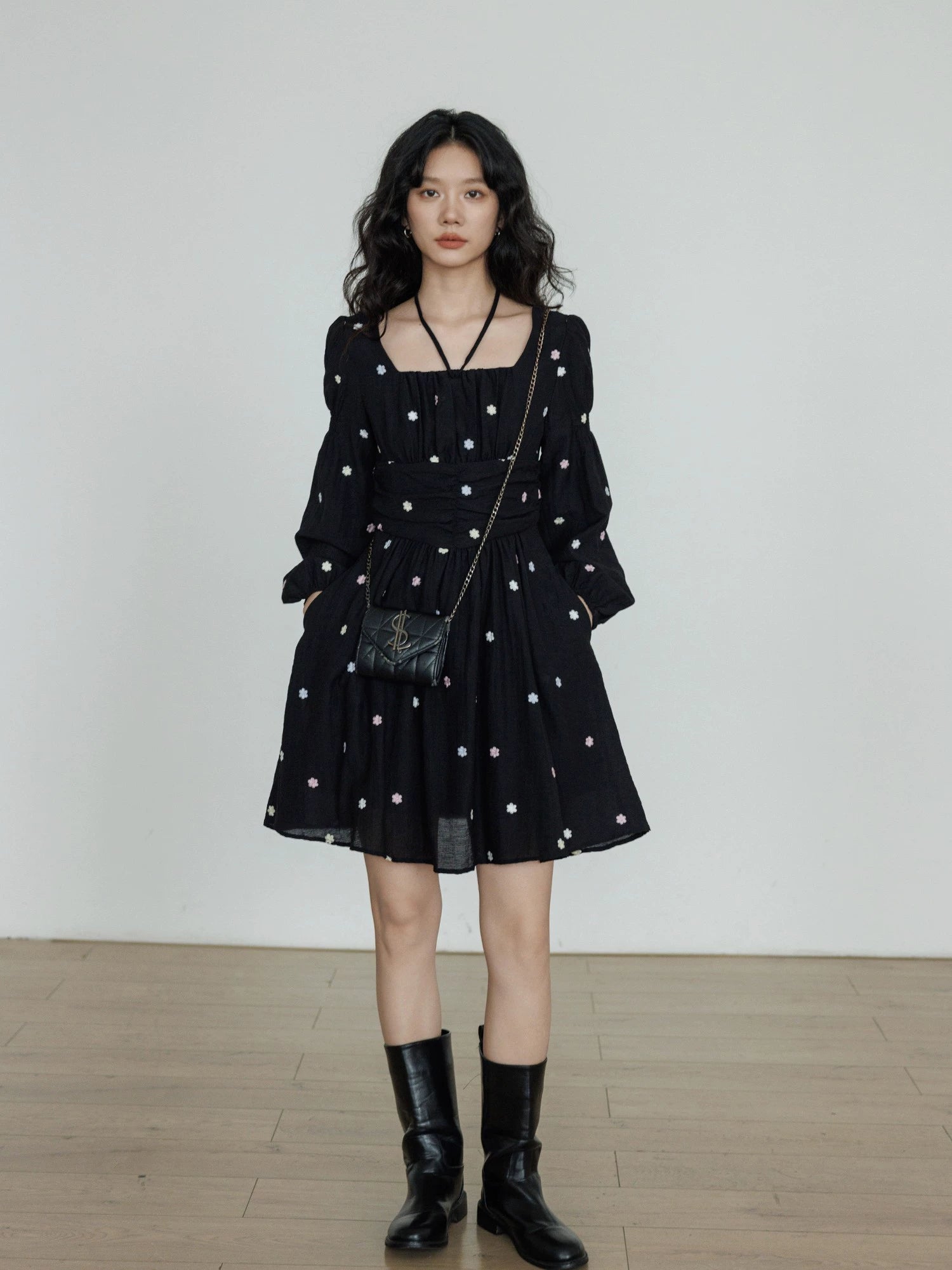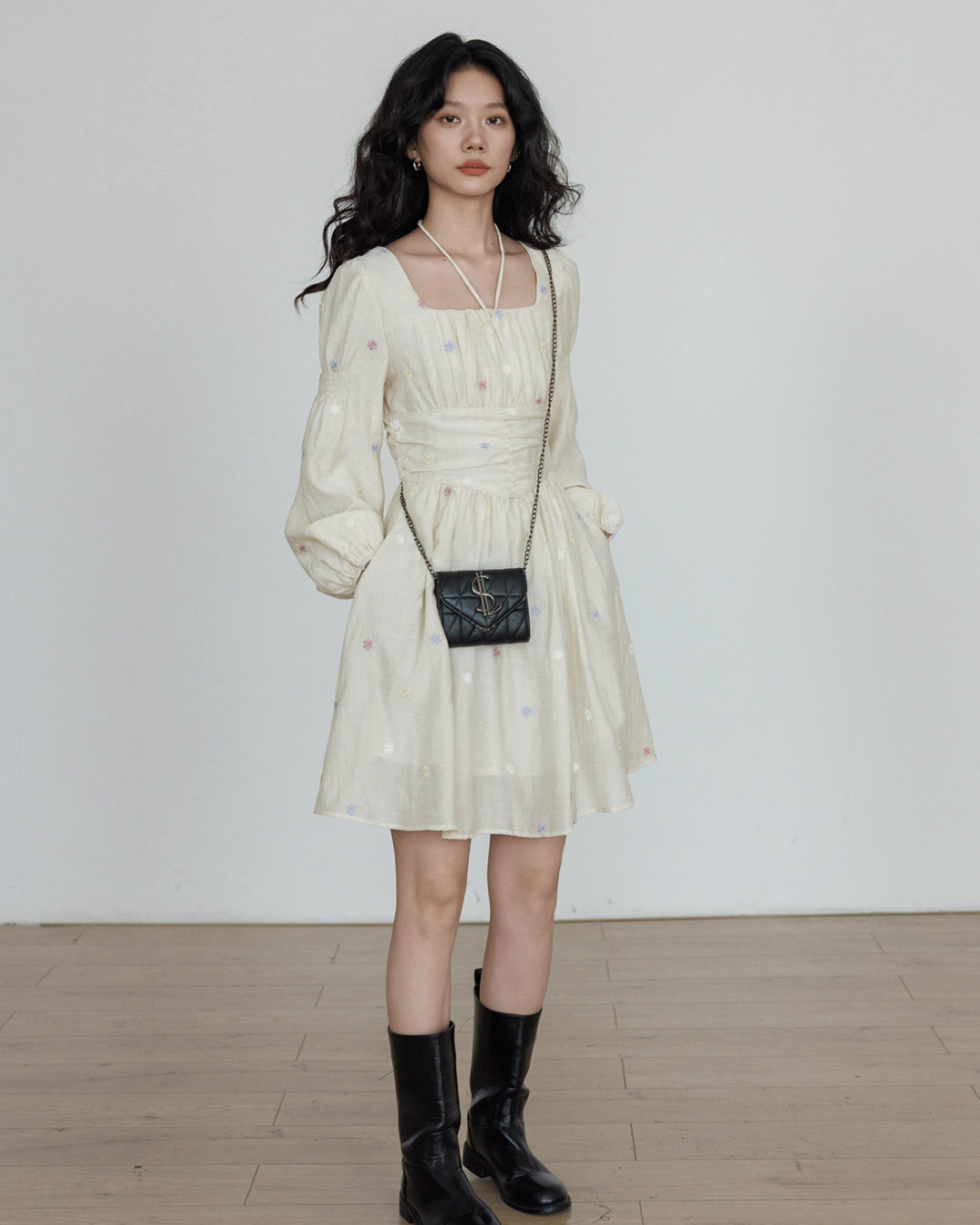 小ぶり花刺繍がフェミニンな印象を与えるワンピース。