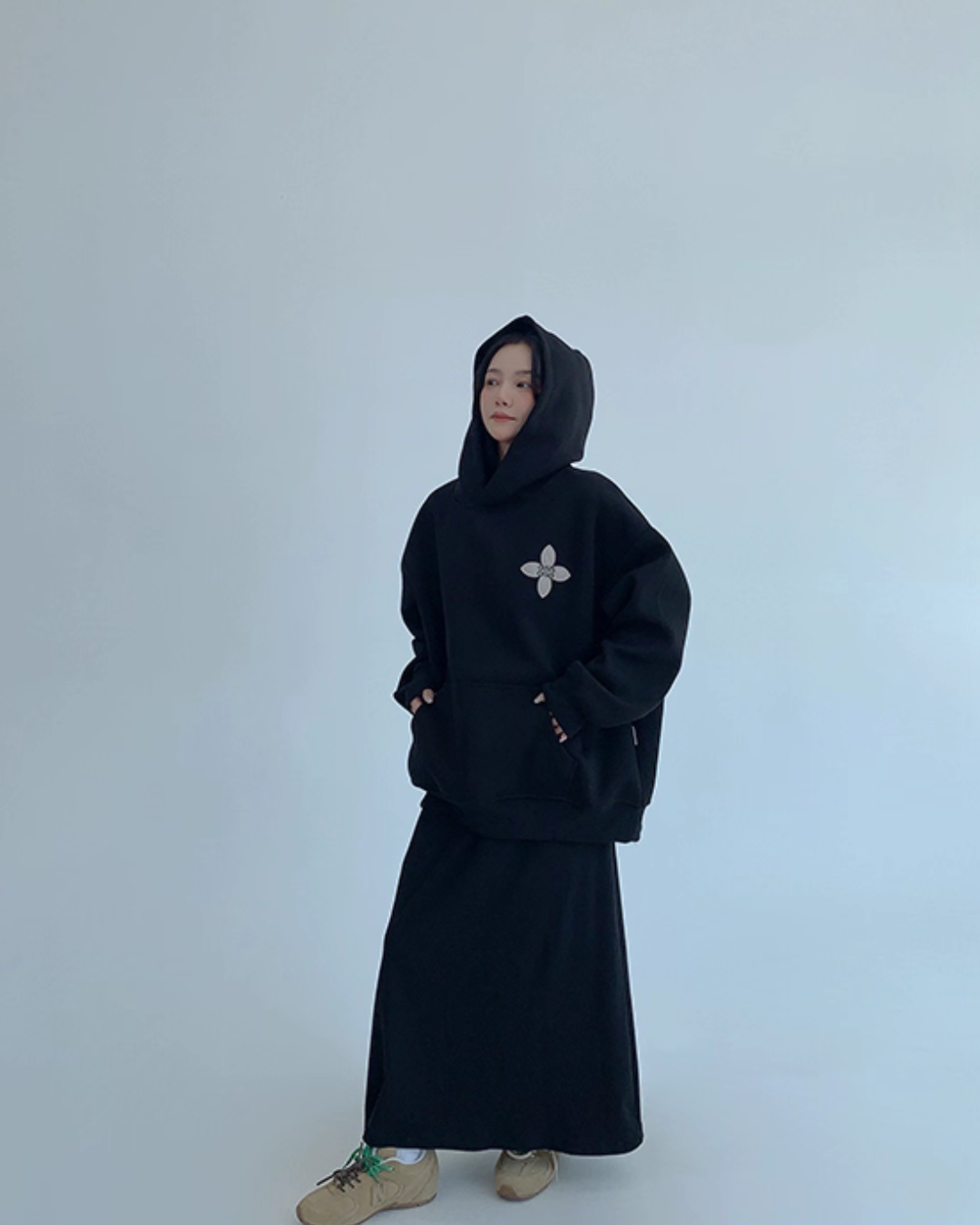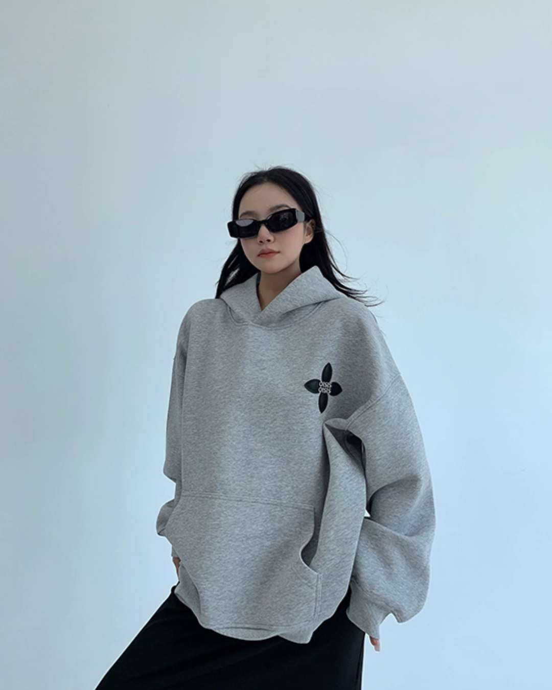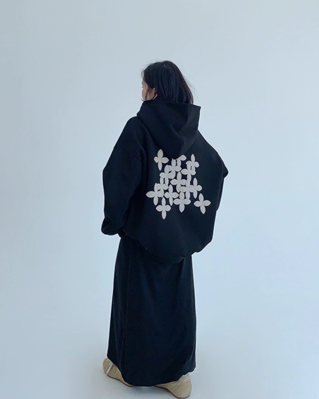 バックに花モチーフを大きくあしらったスウェットパーカー。