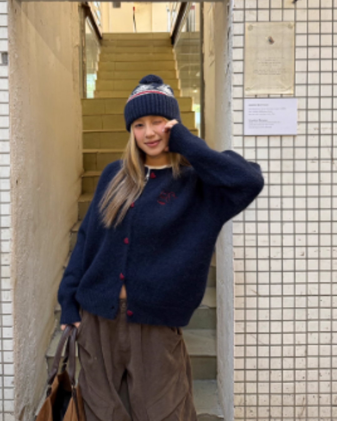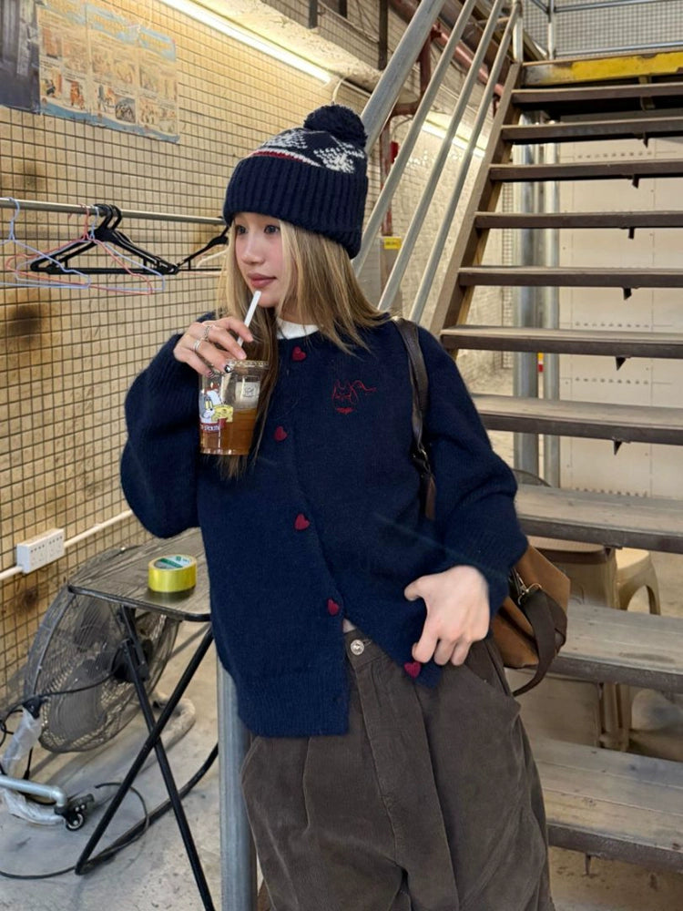 ハートボタンがさりげないチャームポイントになったニットカーディガン。