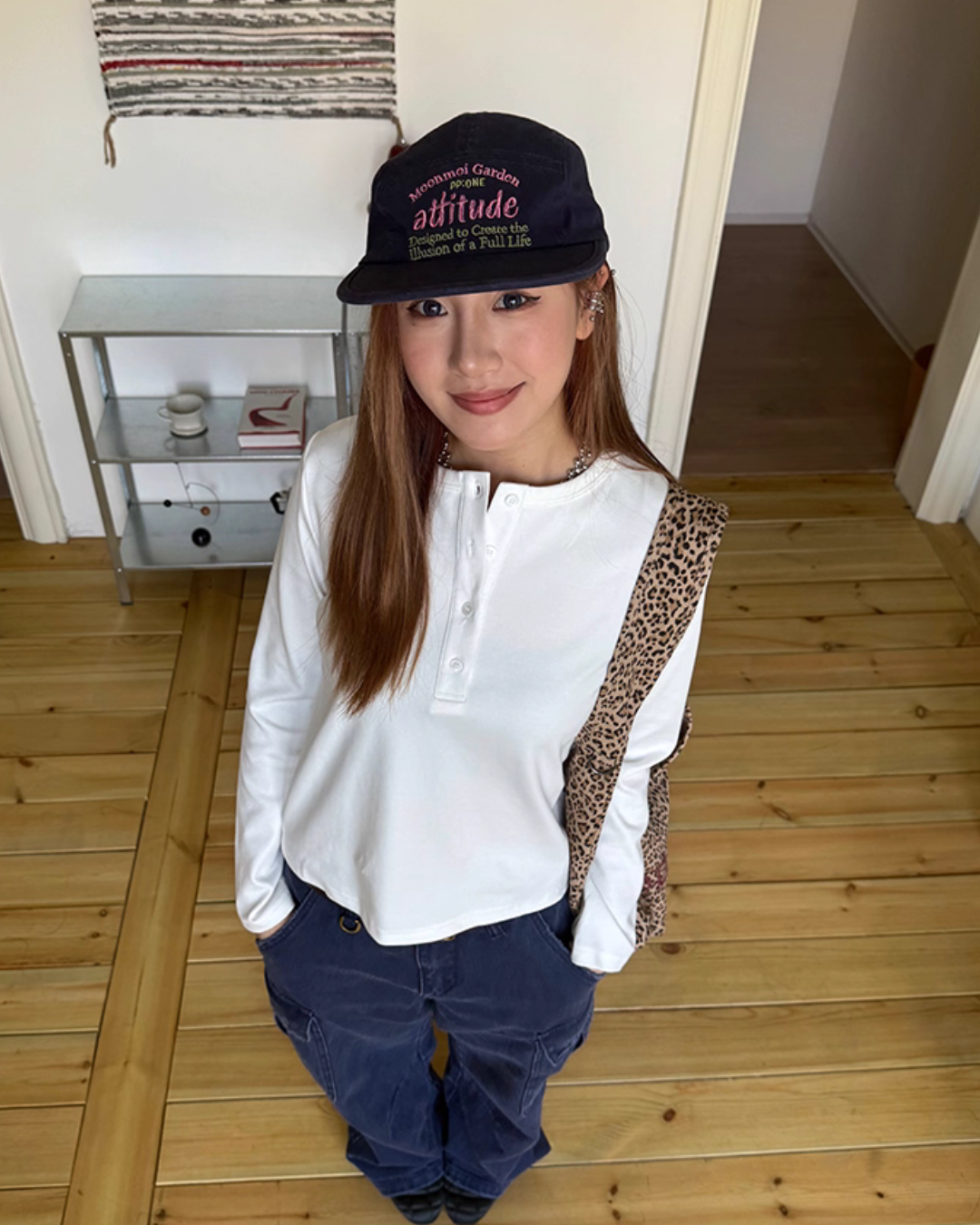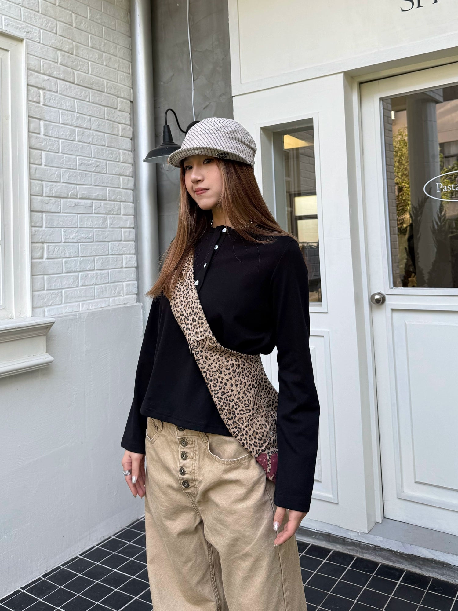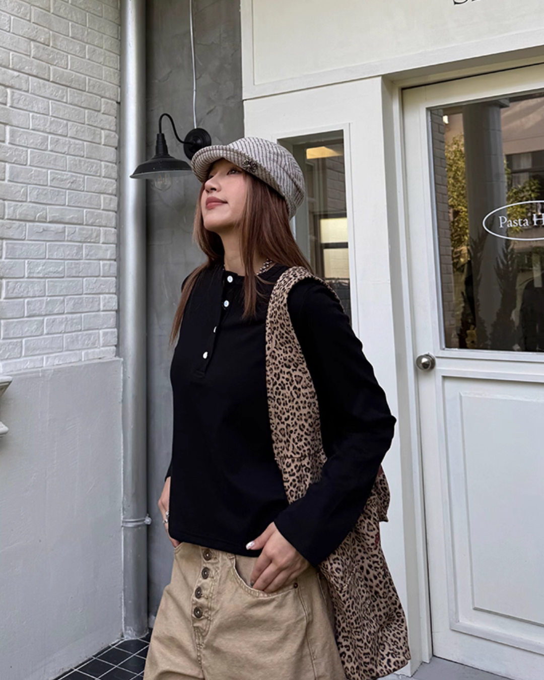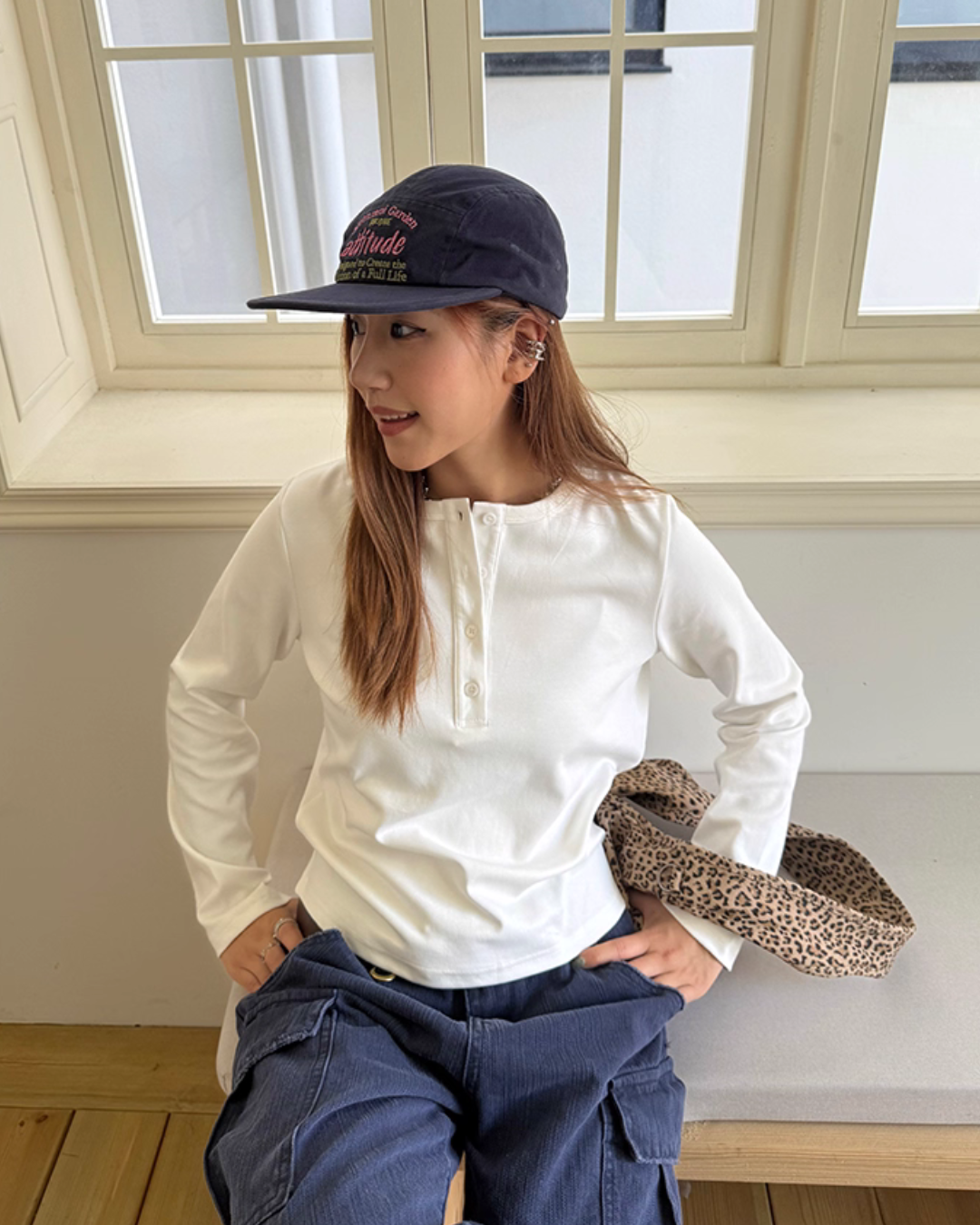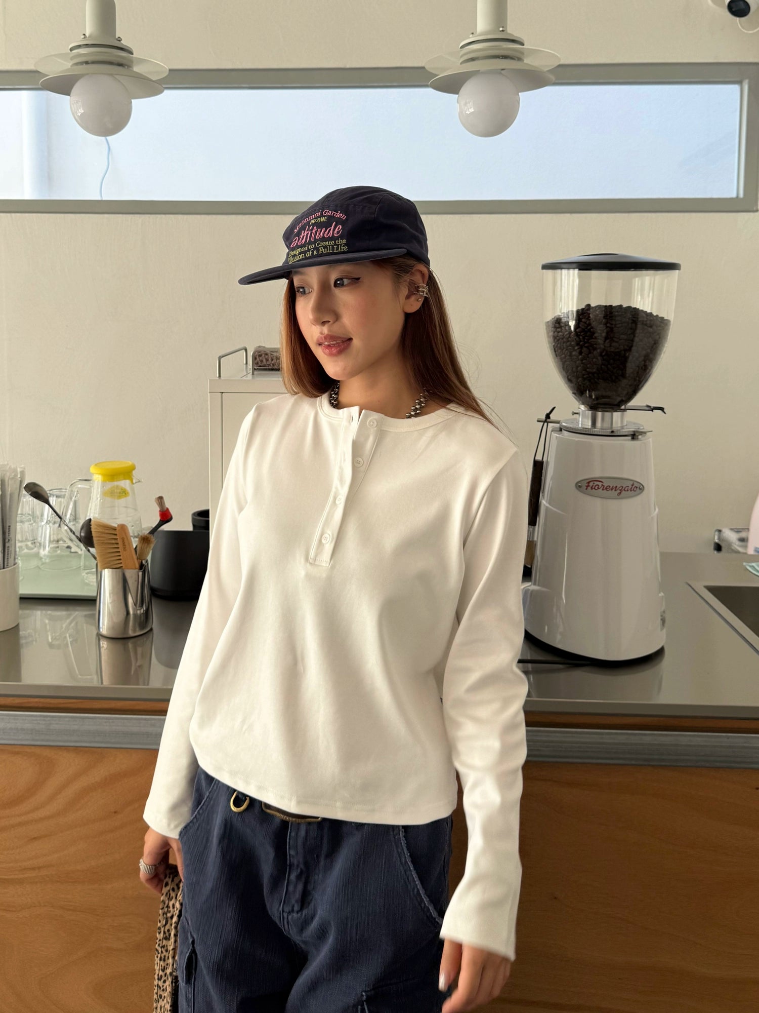 デコルテの印象をアレンジして楽しめるハーフボタントップス。