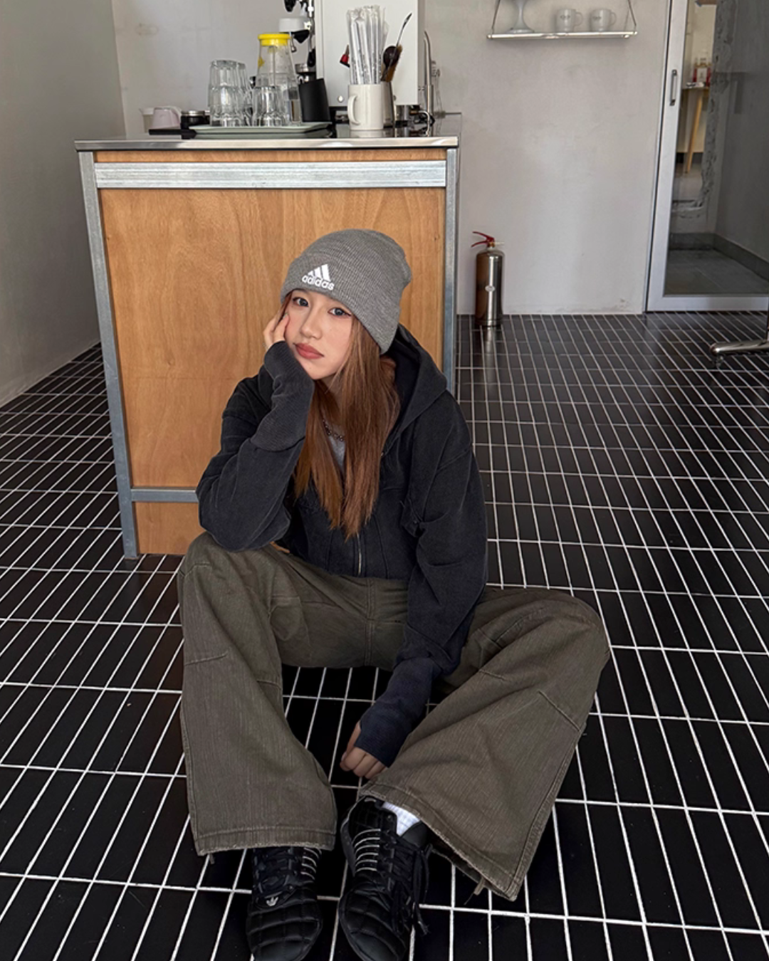 ダブルジップなので、裾を少し開けた着こなしもおすすめ。