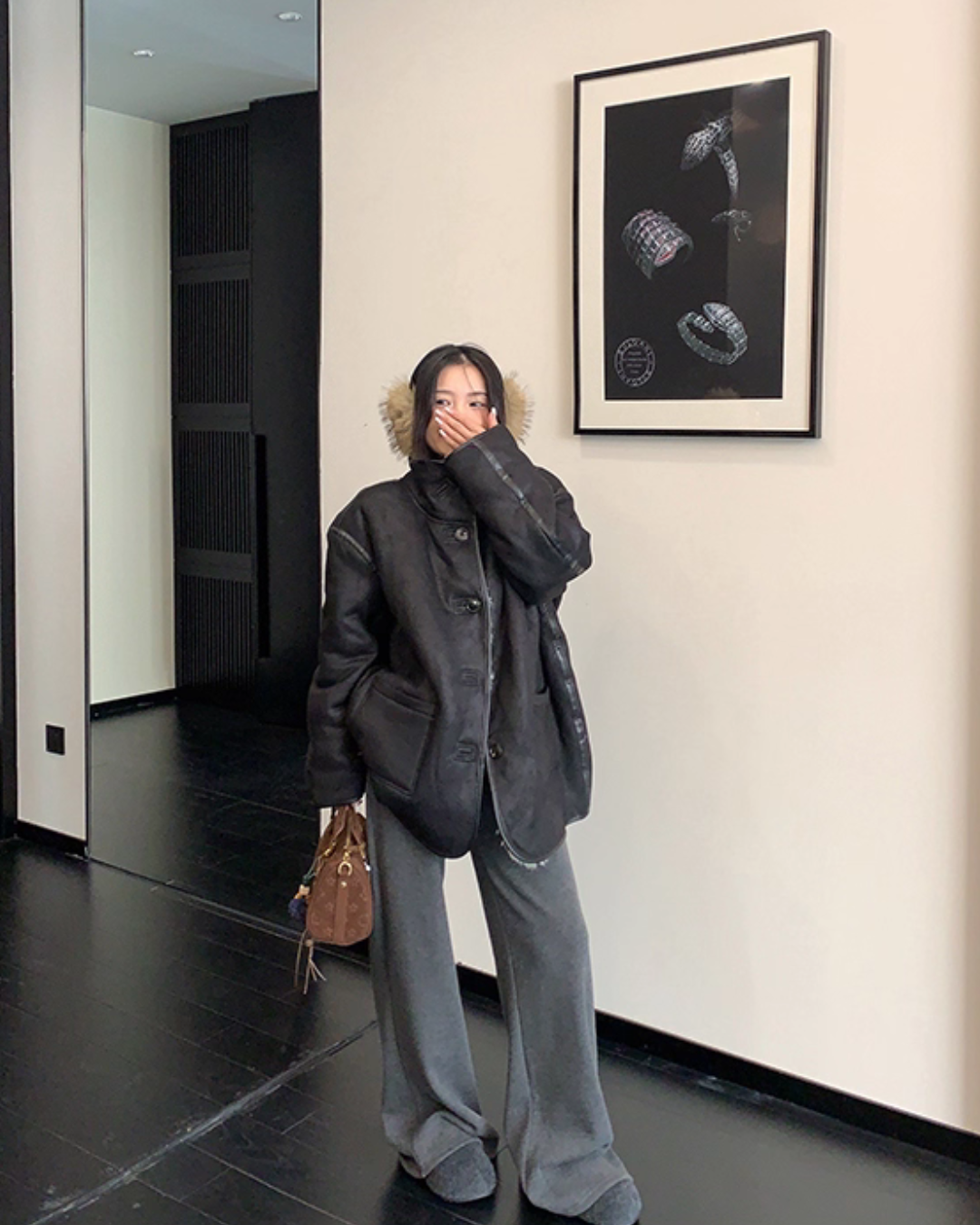 フェイクレザー素材とファーのリバーシブルで、様々な着こなしが楽しめるアウター。