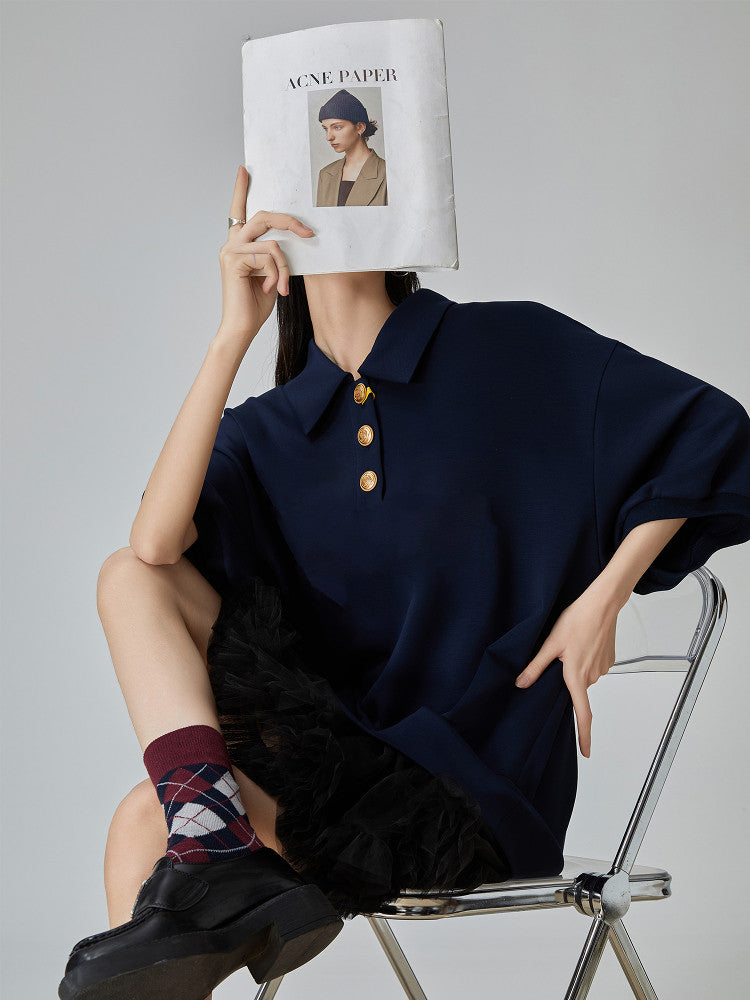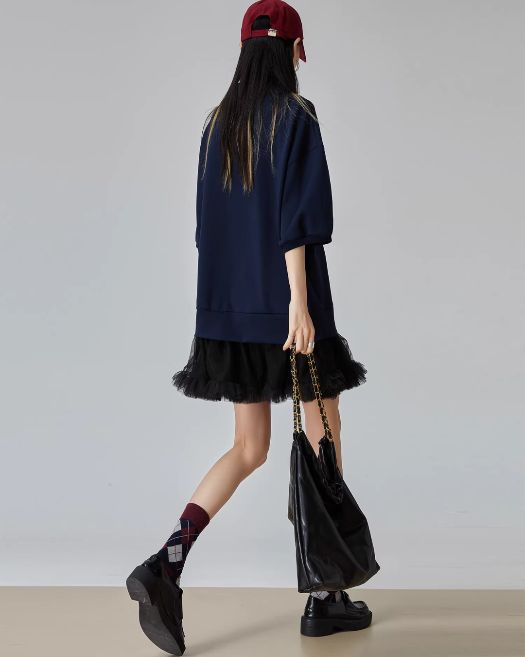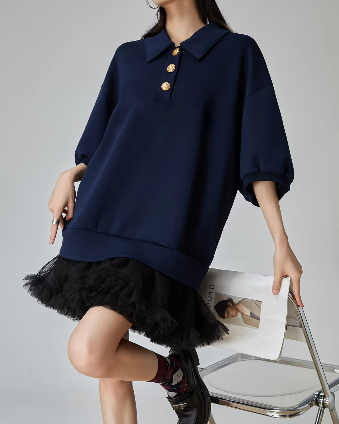 ポロシャツ風トップスとチュールスカートを組み合わせた、ドッキングワンピース。
