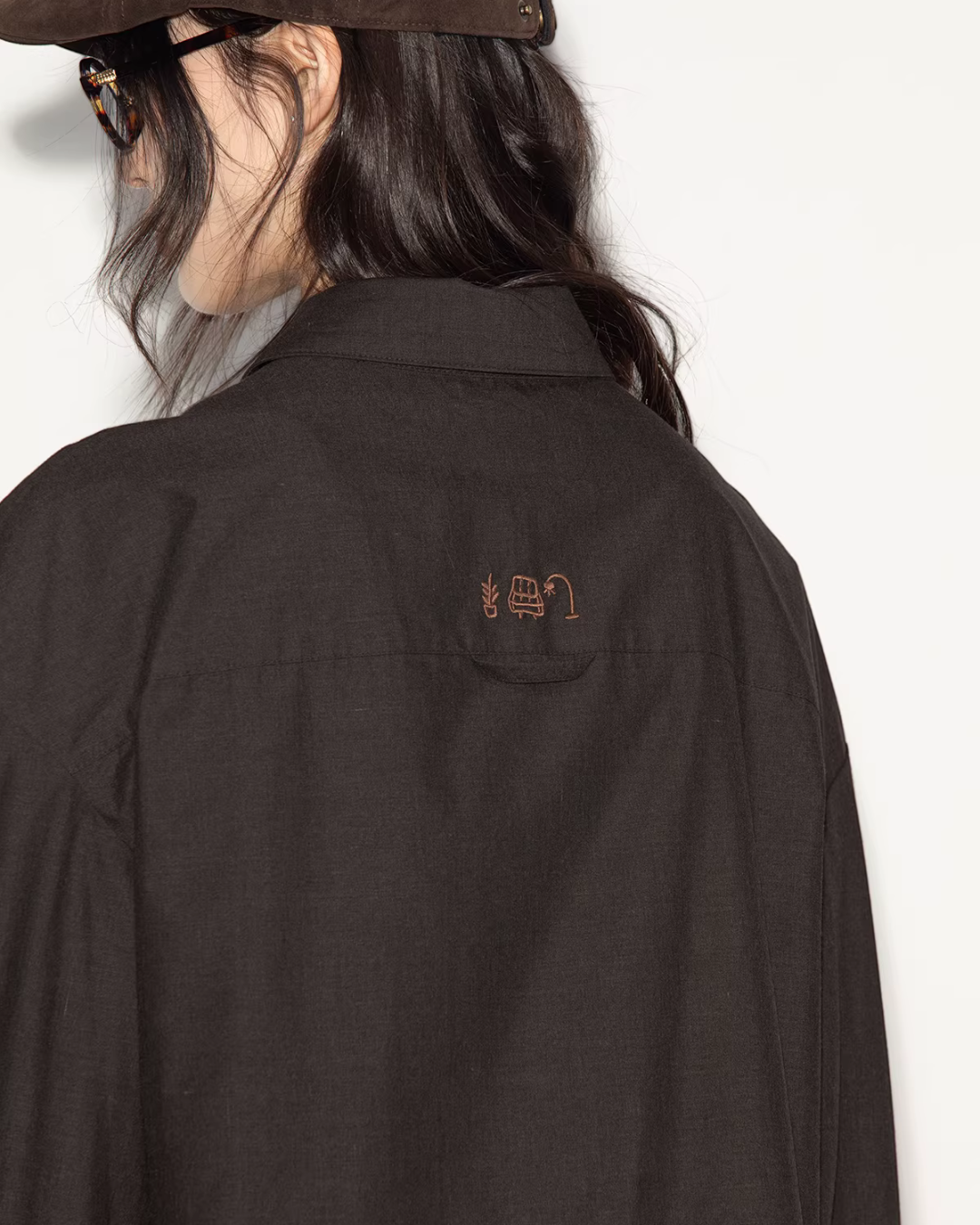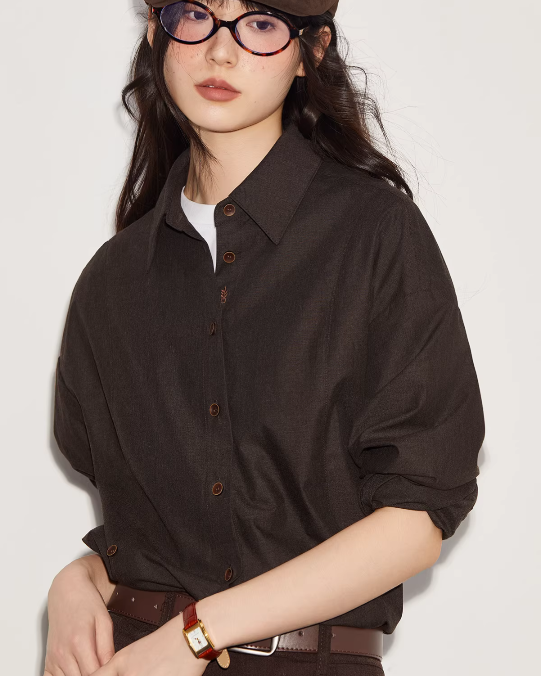 落ち着いたブラウンが温もりを感じさせる、シャツ&スカートのセットアップ。