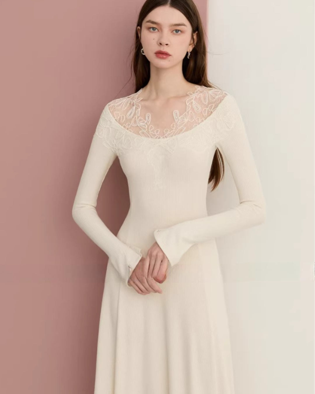 オフショルダーデザインにクロシェレースをあしらい、女性らしさをより一層引き立てる。