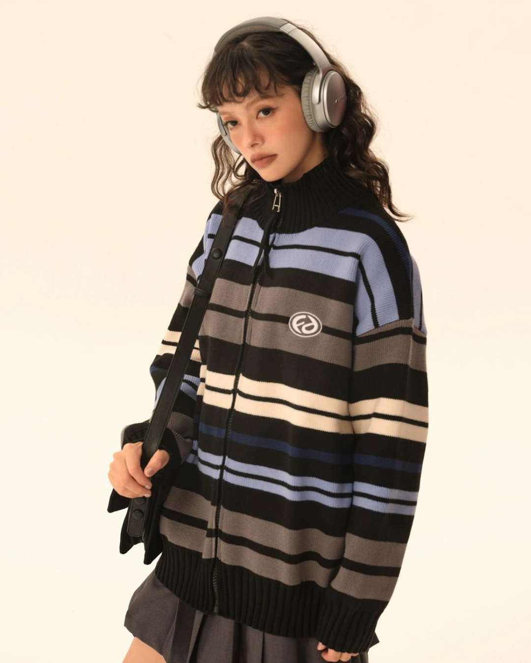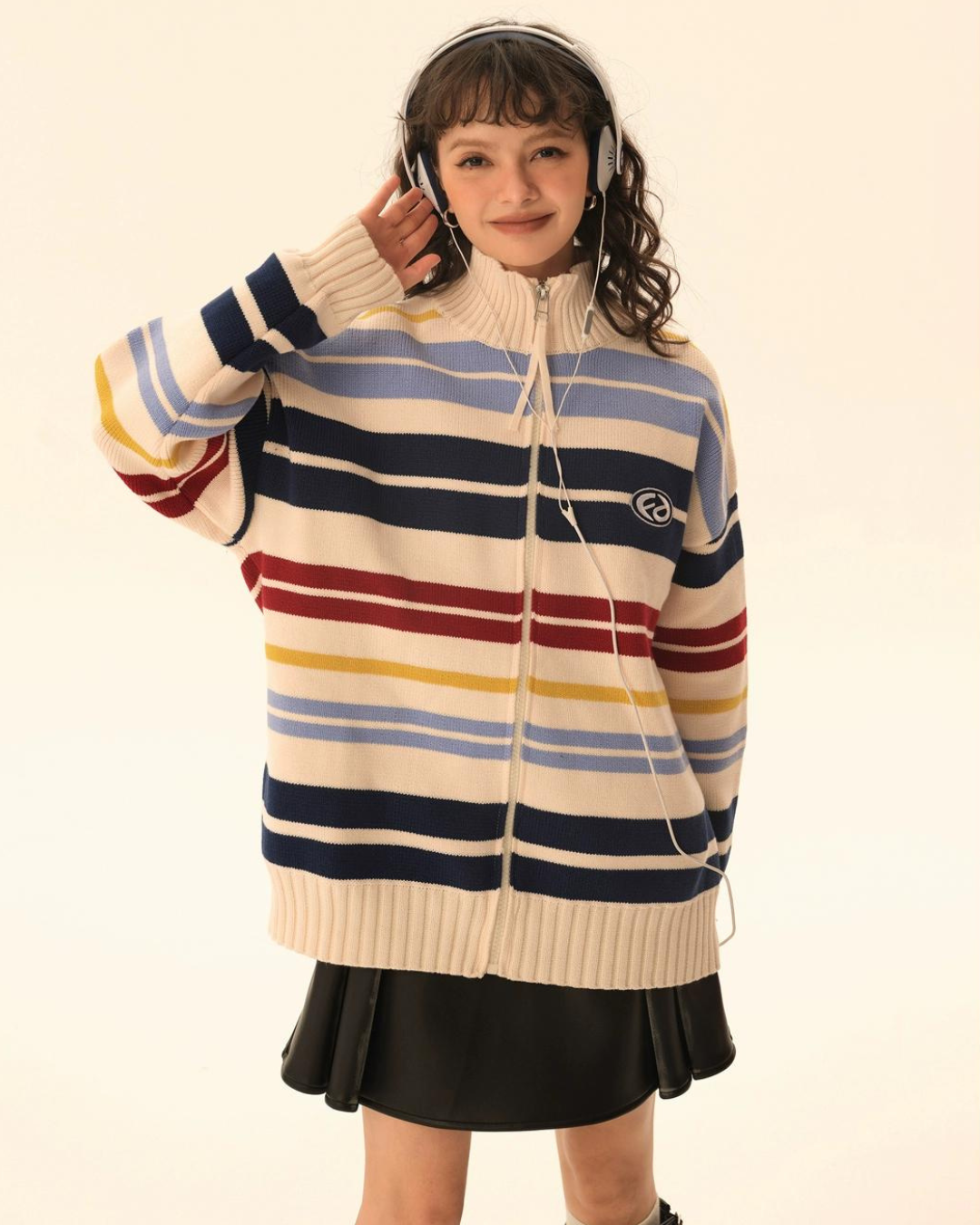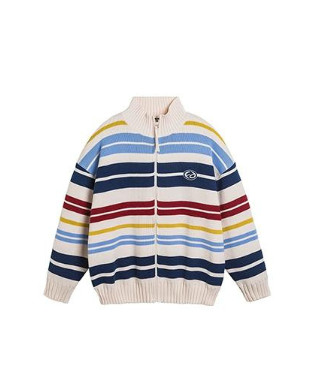 レトロなボーダー柄が目を惹くタートルネックジップカーディガン。