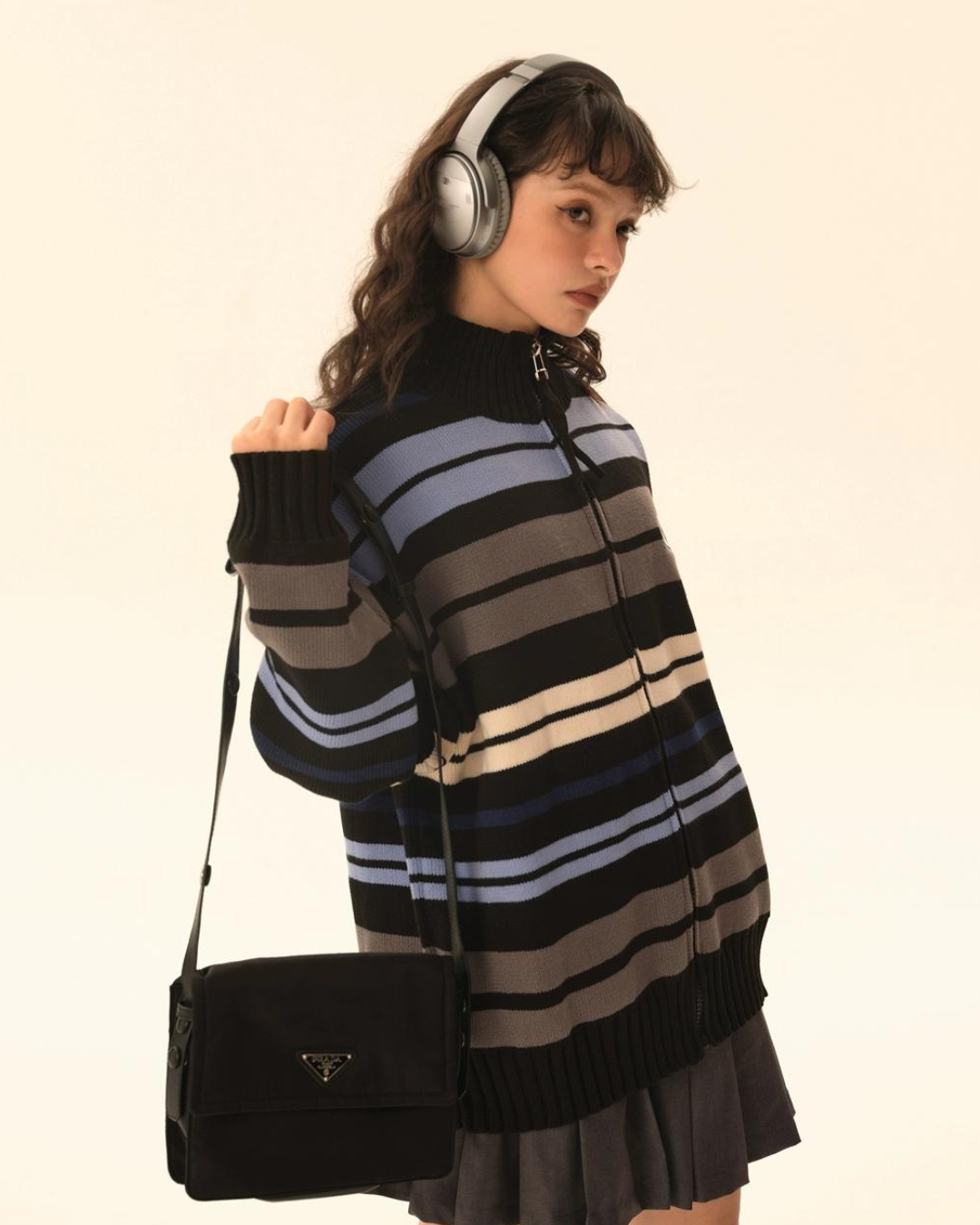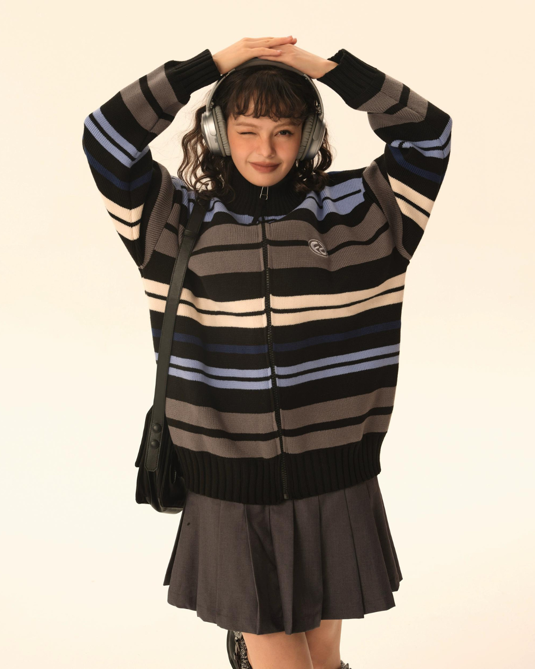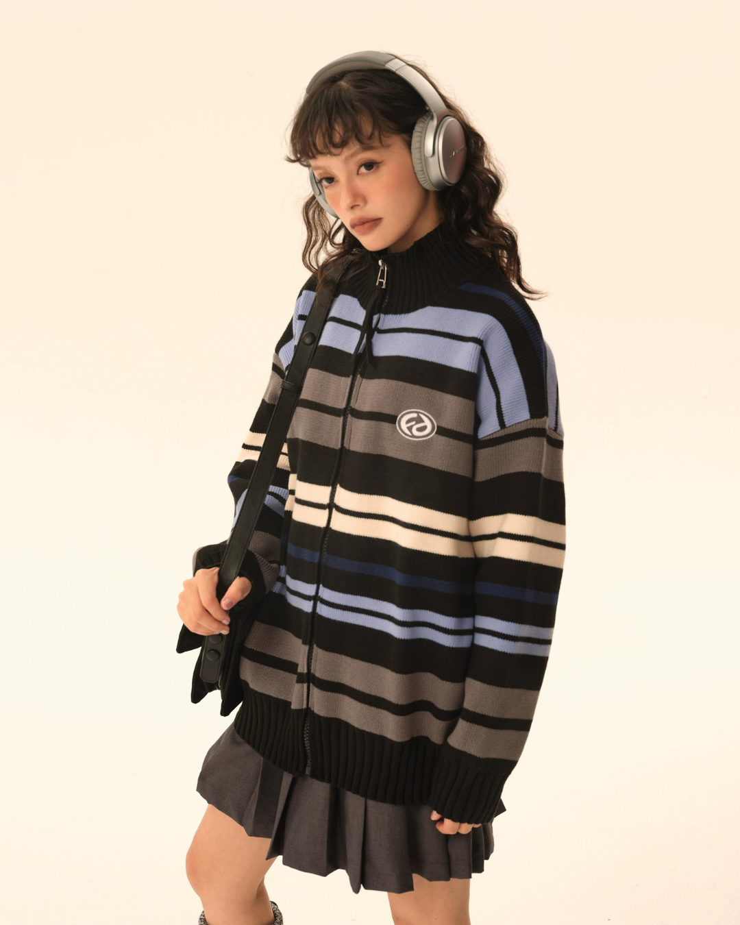 レトロなボーダー柄が目を惹くタートルネックジップカーディガン。