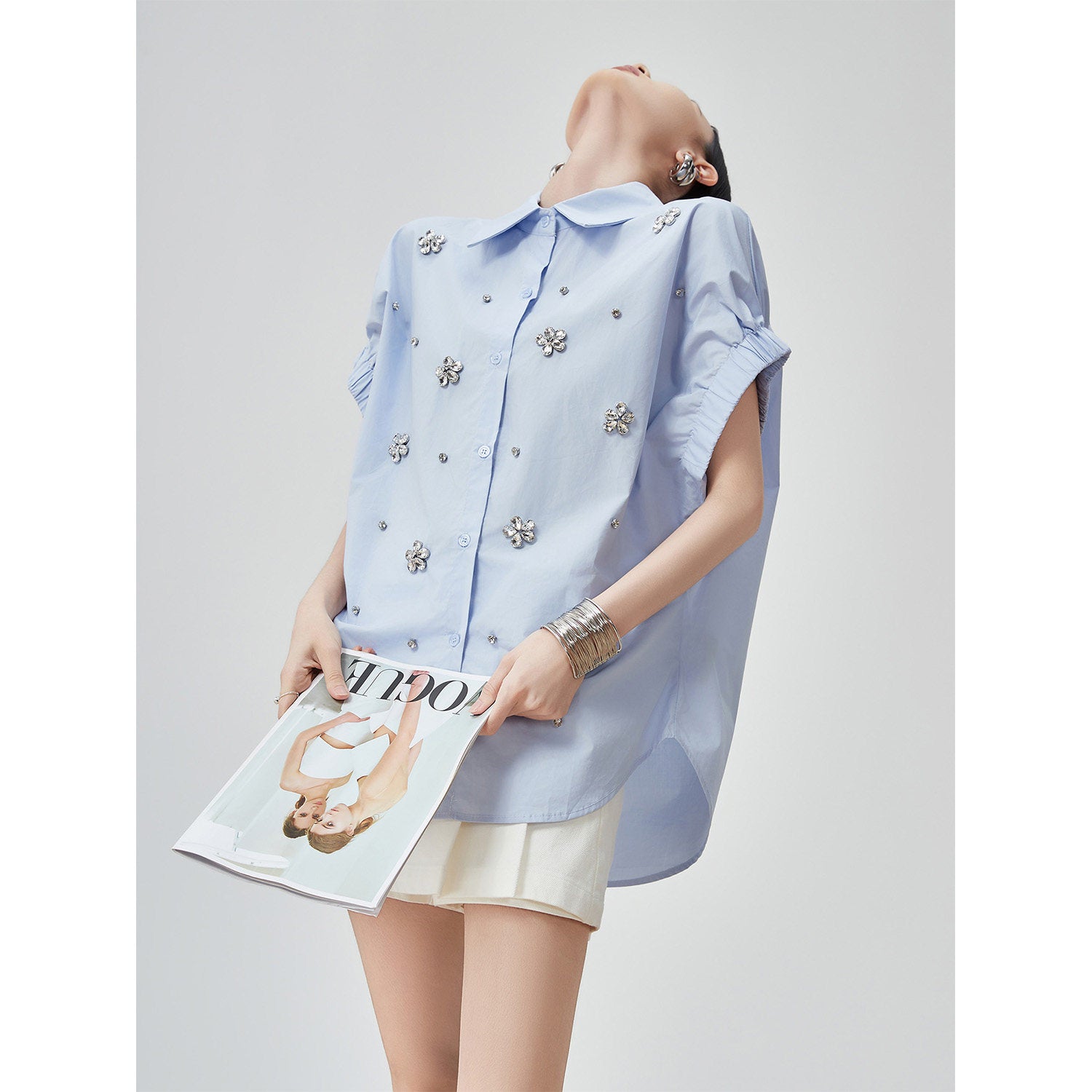 キラキラと上品に輝くビジューを添えた半袖シャツ。