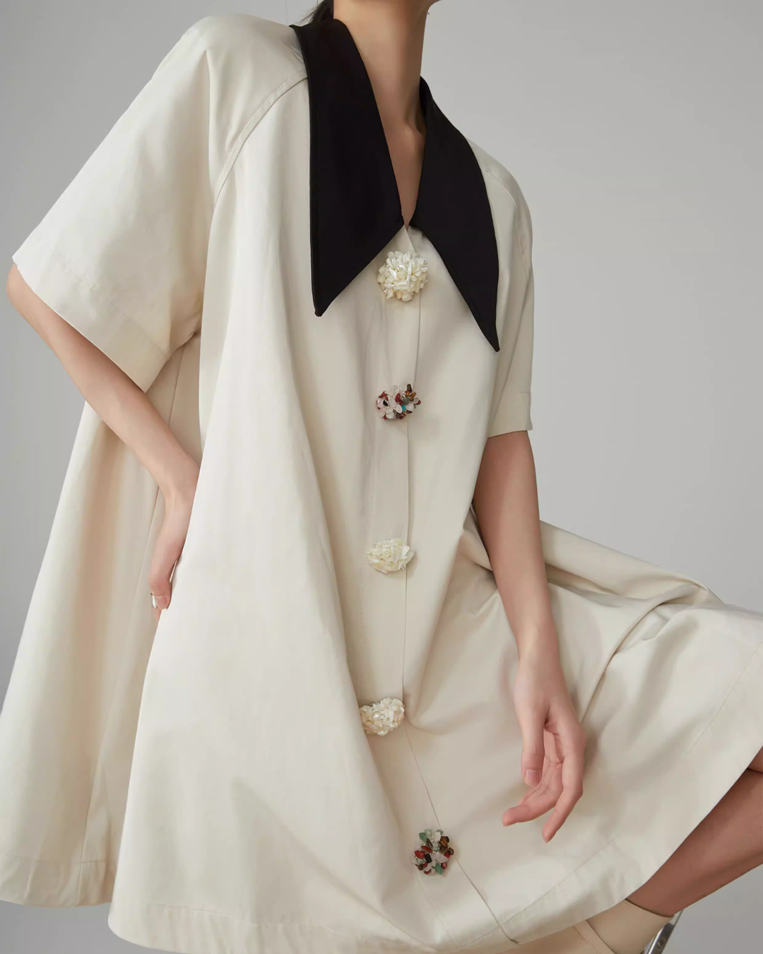 フラワーボタンがぐっと季節感が増し、華やかな雰囲気に。
