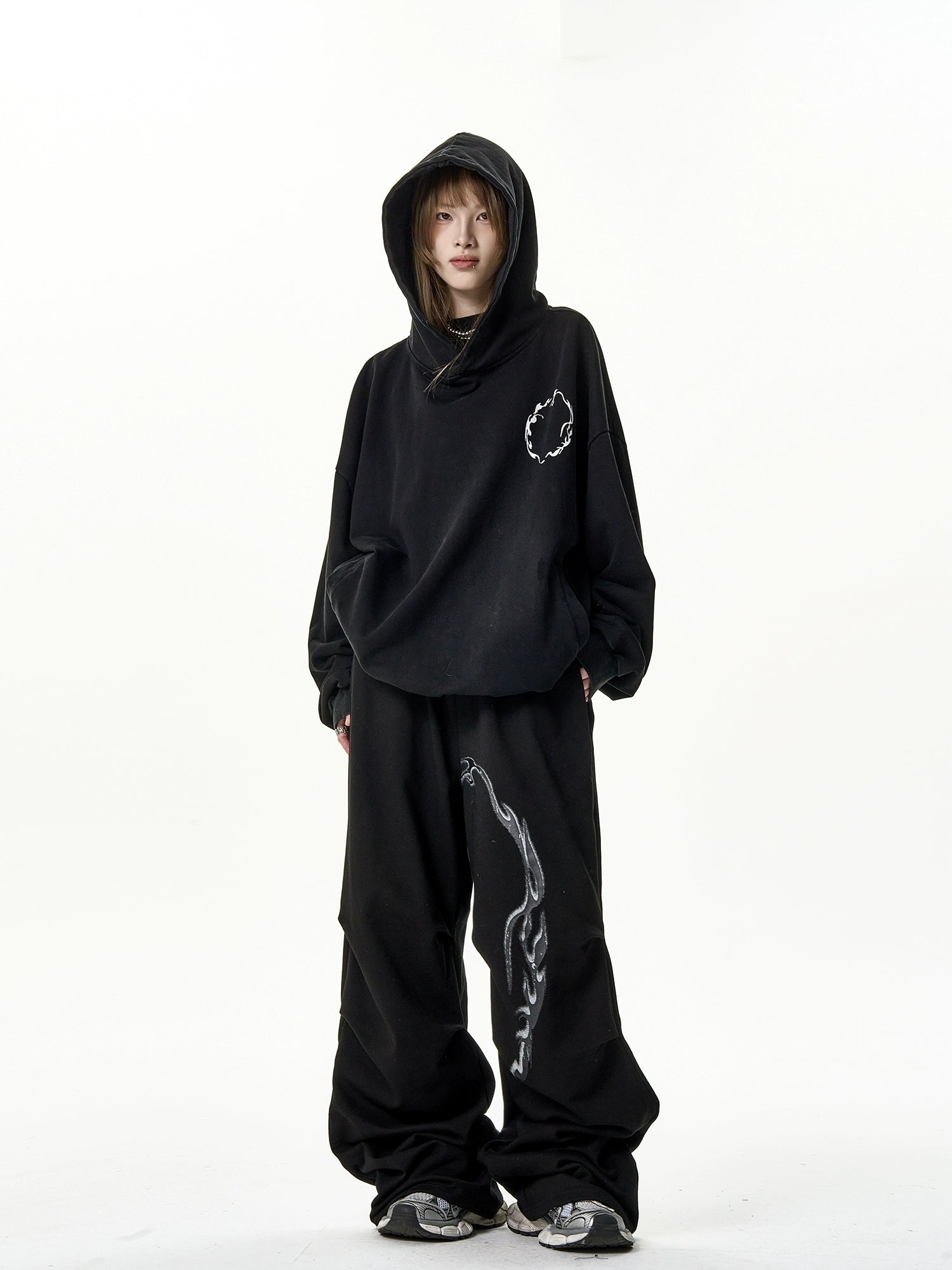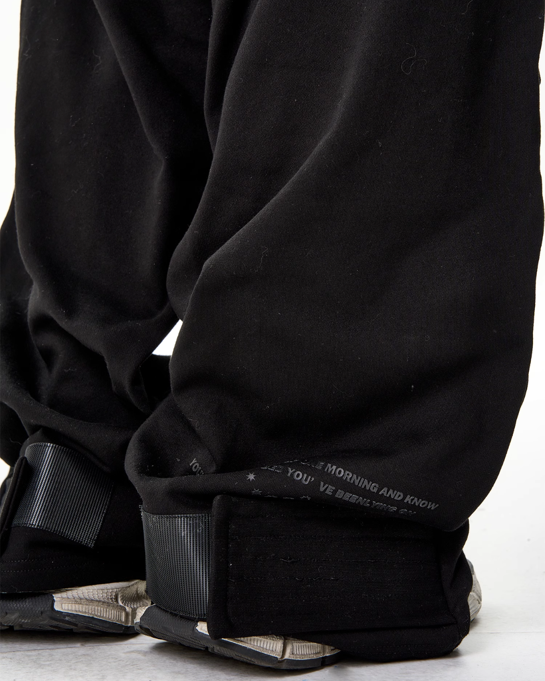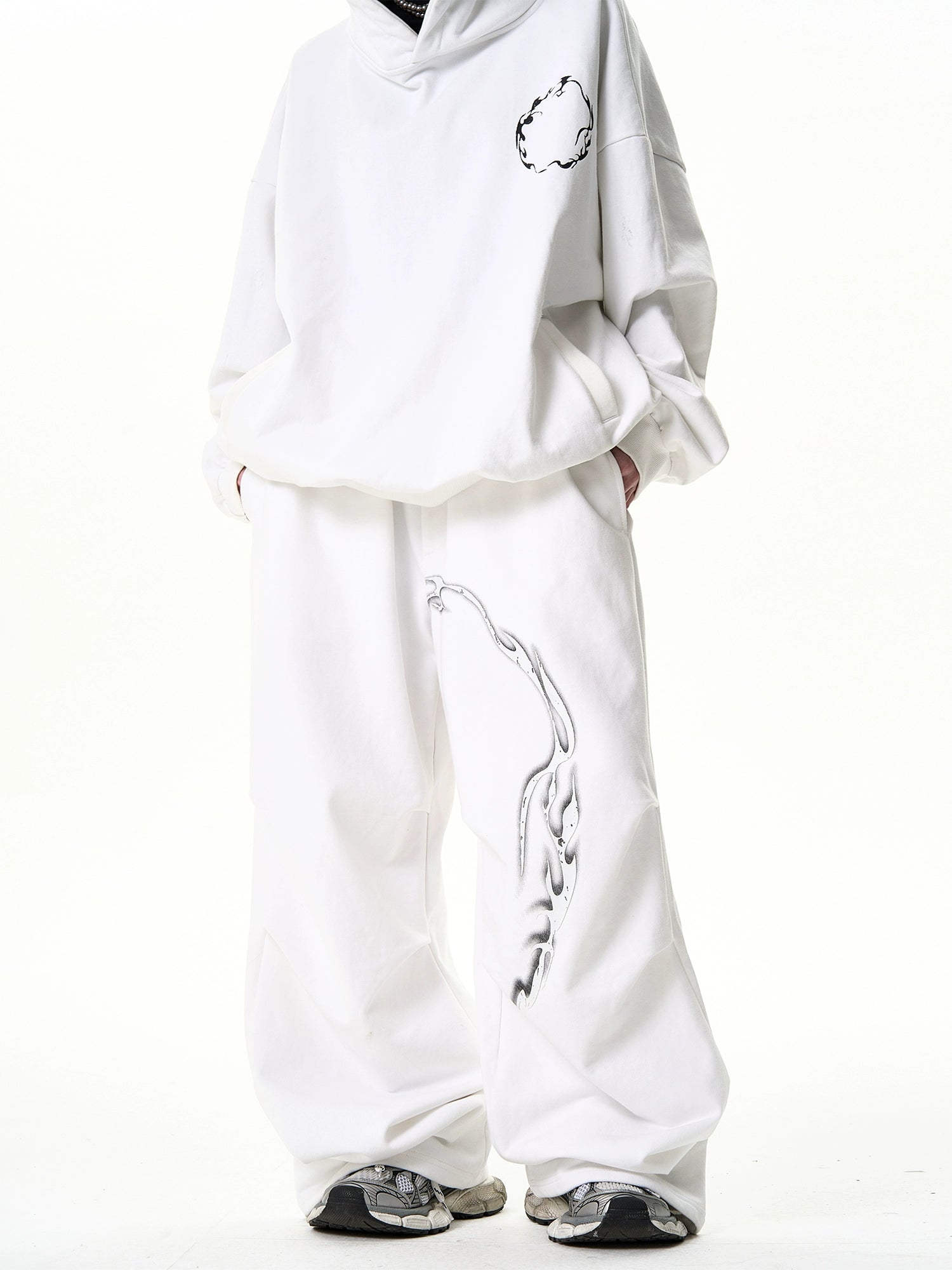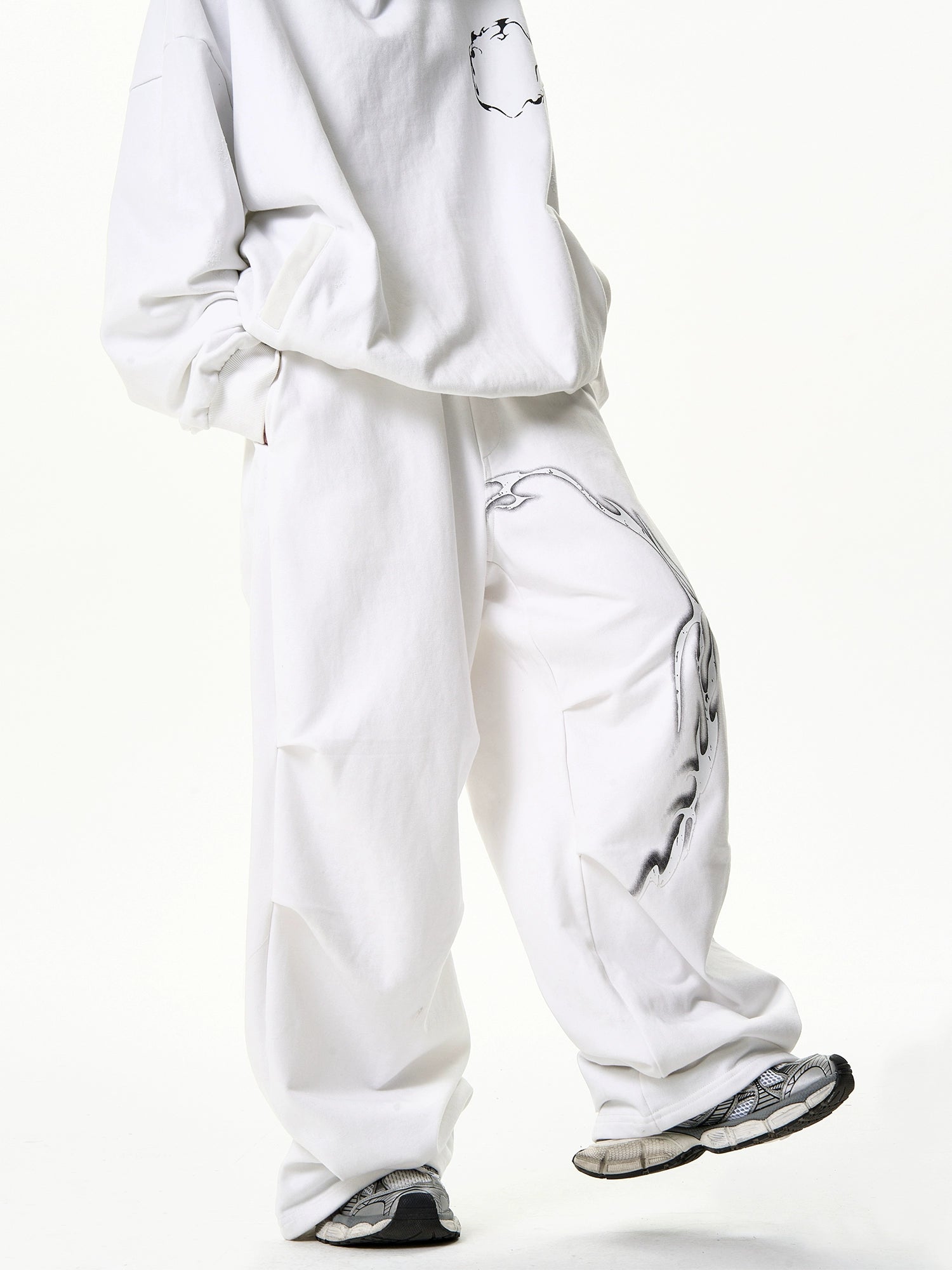 独特なデザインアートが施されたスウェットパンツ。
