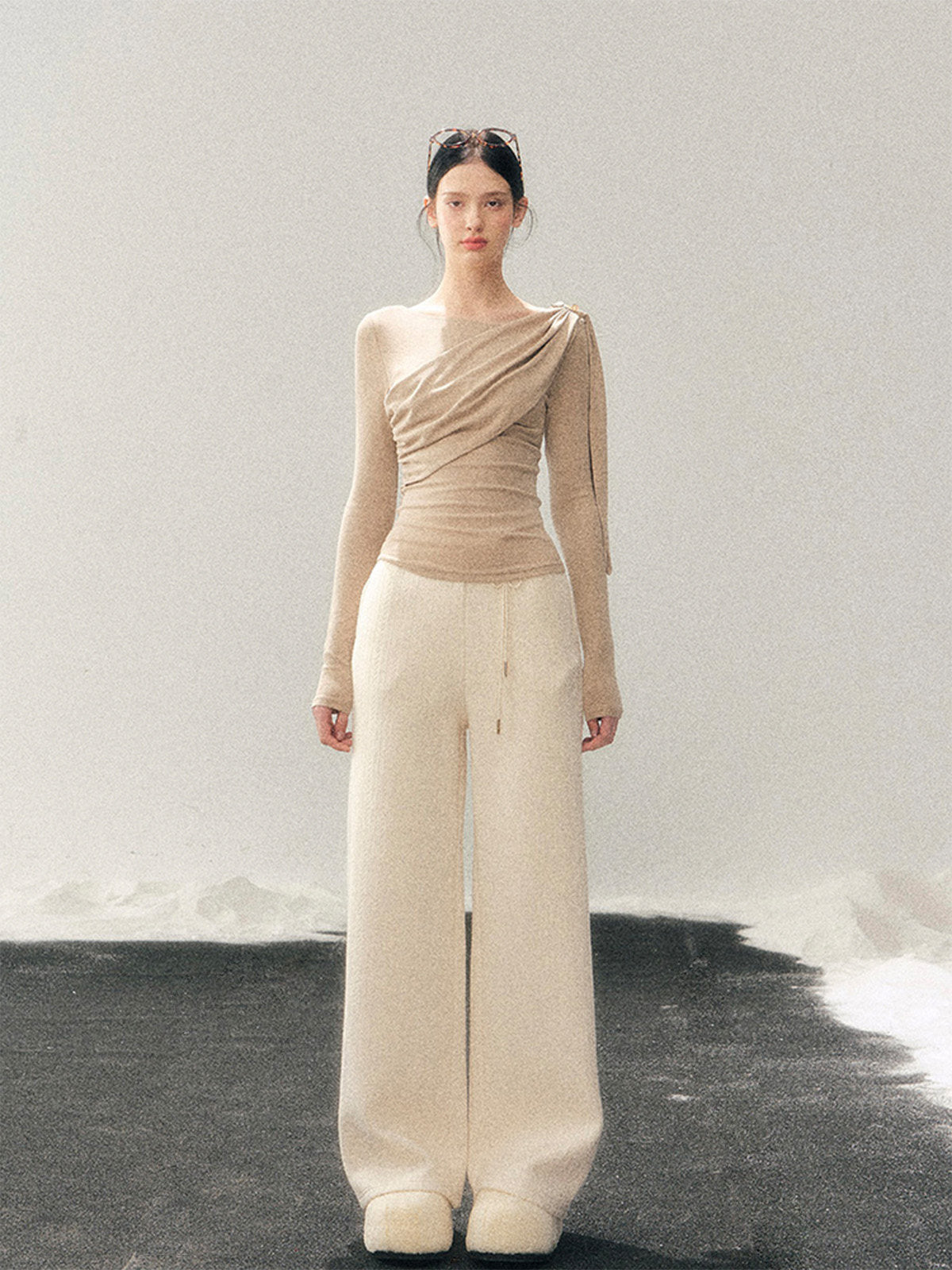 さりげないドレープがフェミニンな印象を与えるトップス。