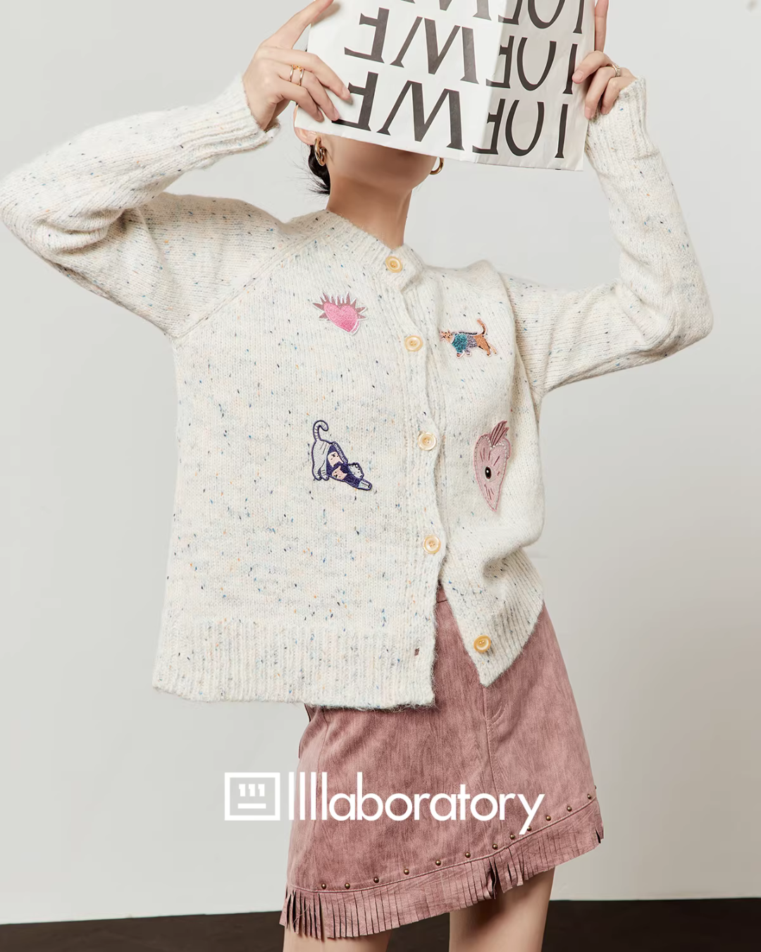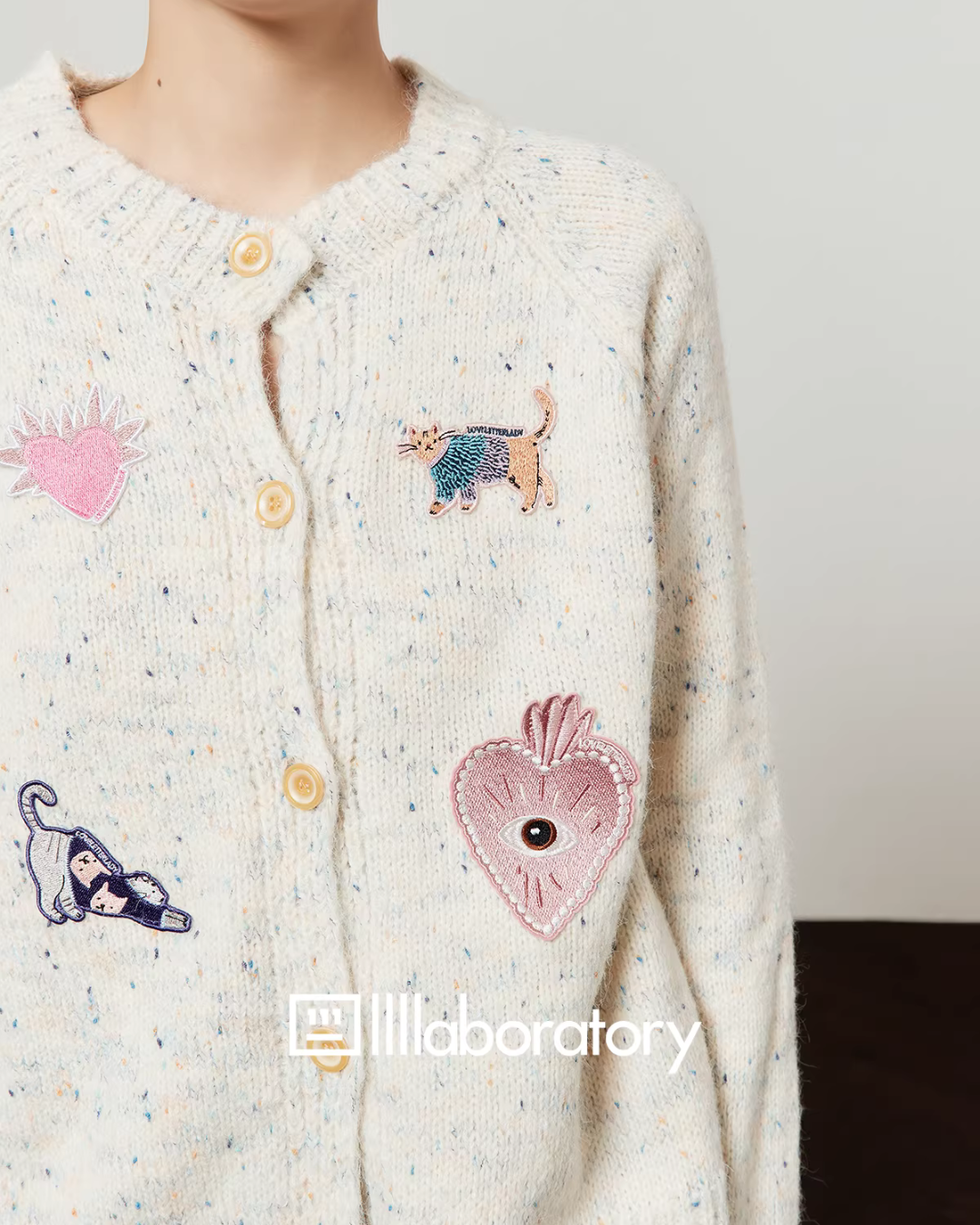 遊び心溢れるワッペンが目を引くデザインニット。