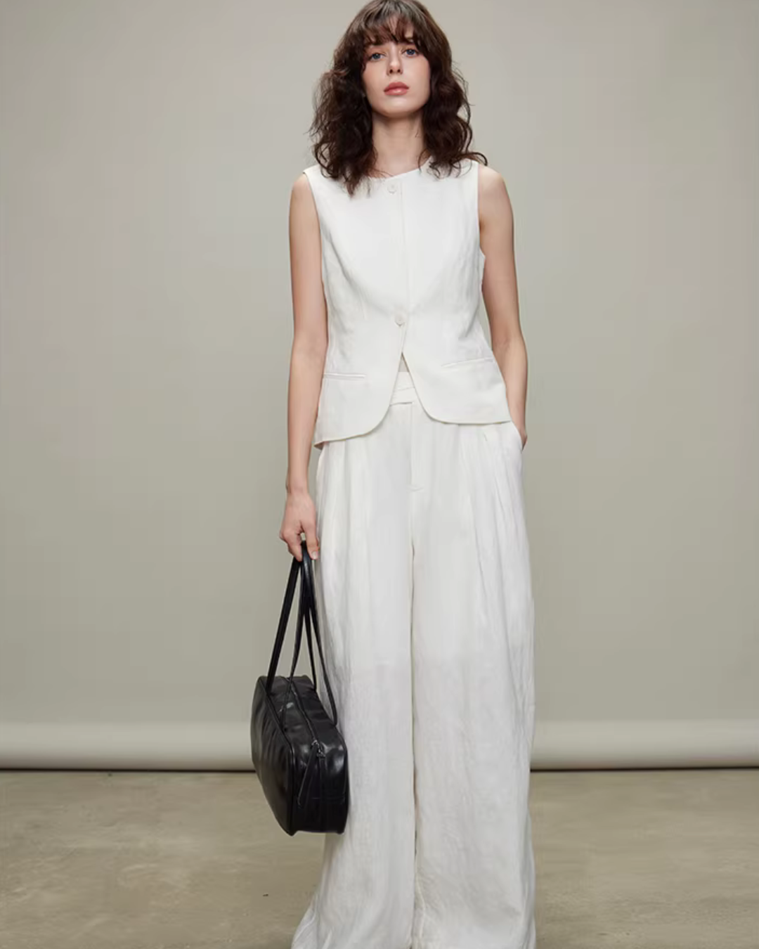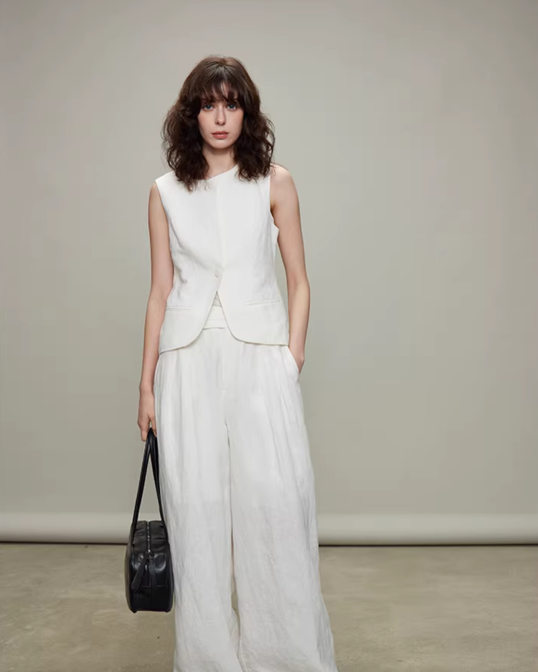 ゆとりのあるワイドパンツが脚のラインをきれいなストレートに整え、縦長効果も。
