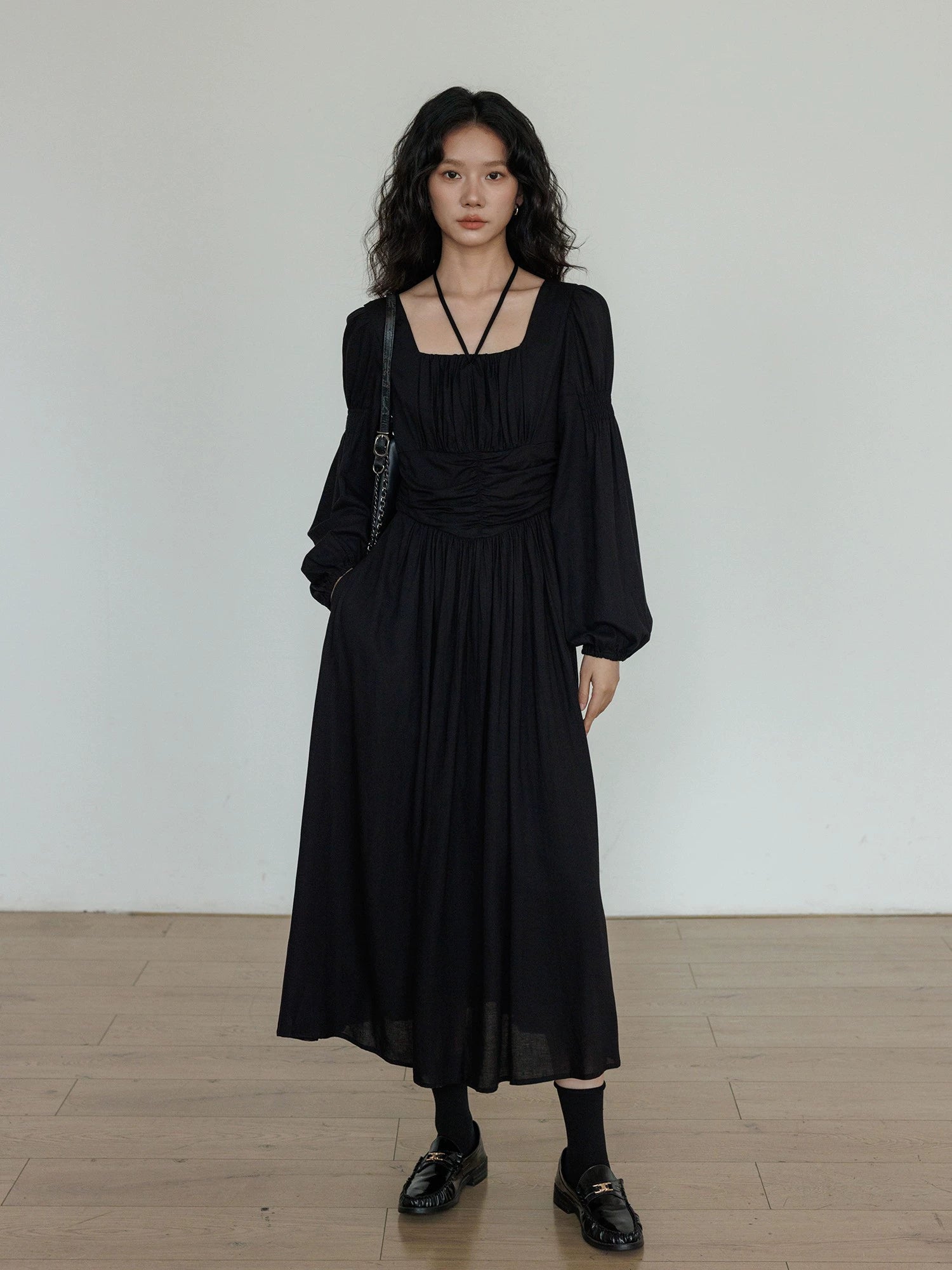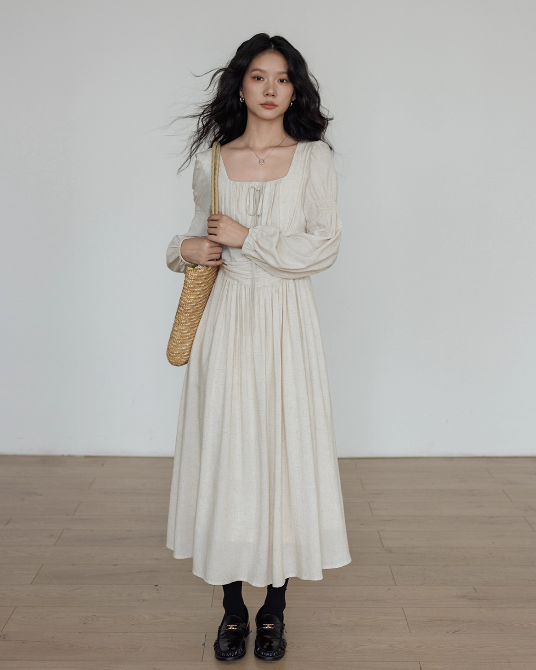 デコルテを綺麗に見せてくれるスクエアネックのロングワンピース。