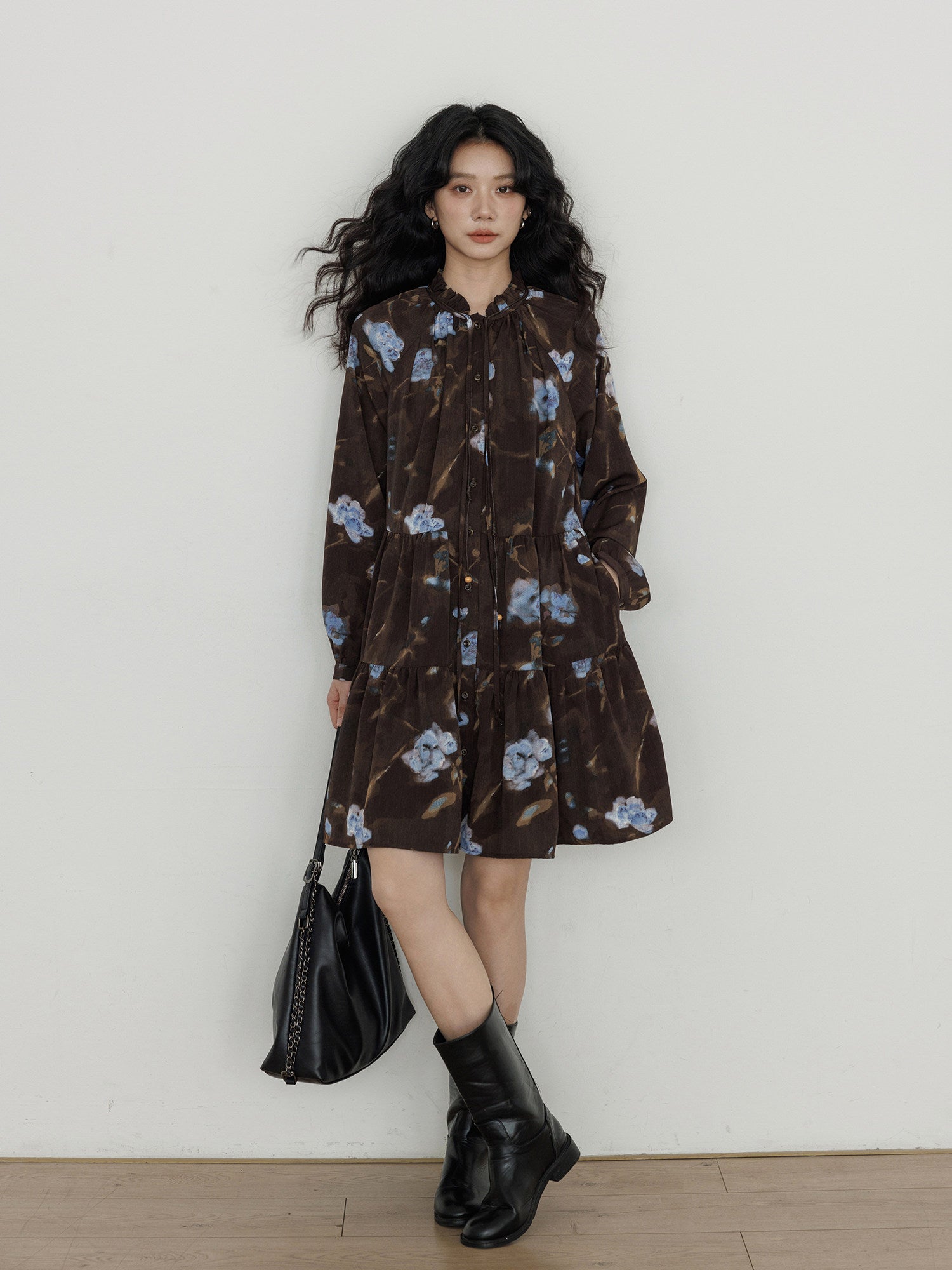 ブラウンカラーとフラワープリントがエレガントな雰囲気のワンピース。