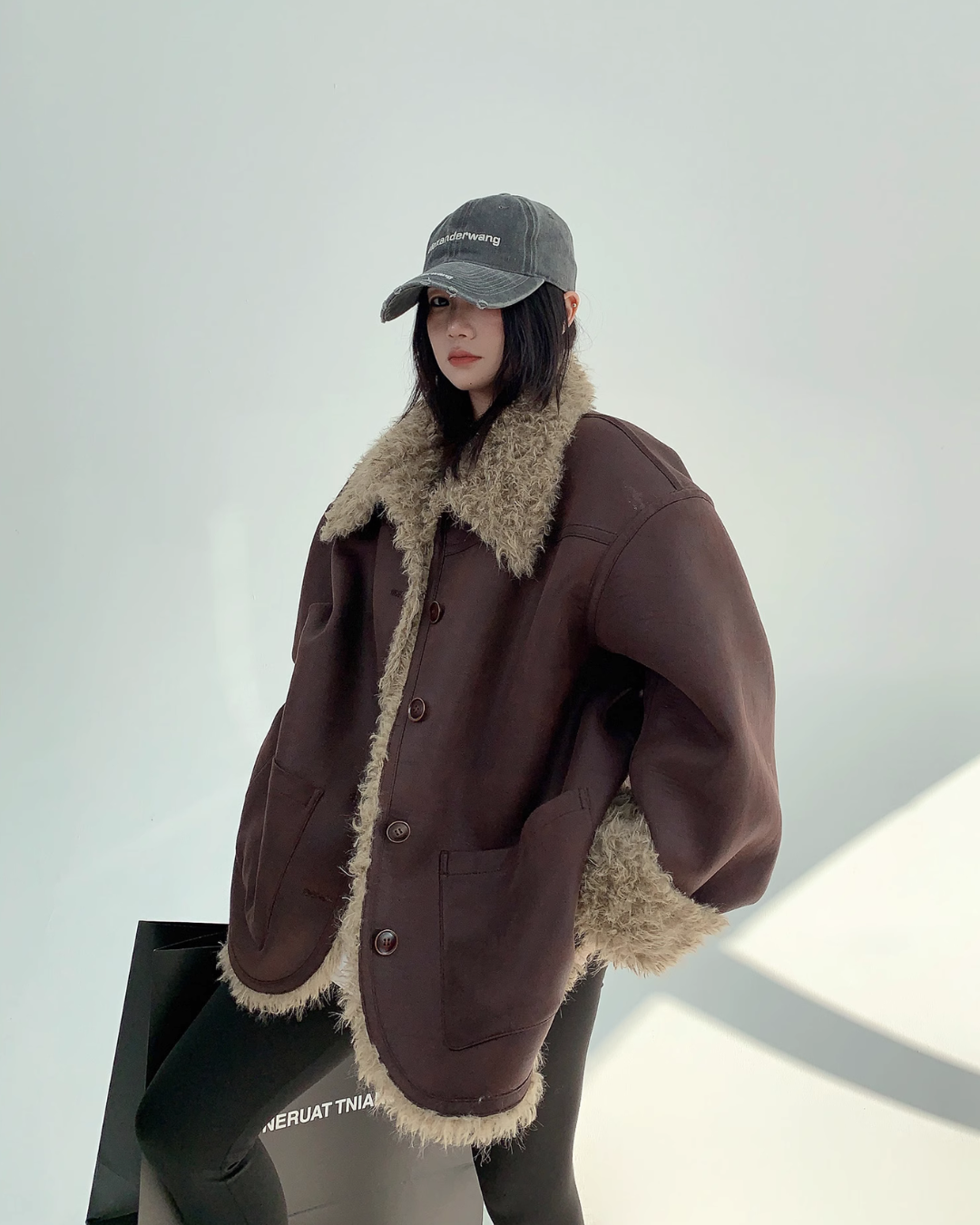 ふわふわとした素材感が暖かみを与え、ポケット付きで実用性も兼ね備えた一枚。