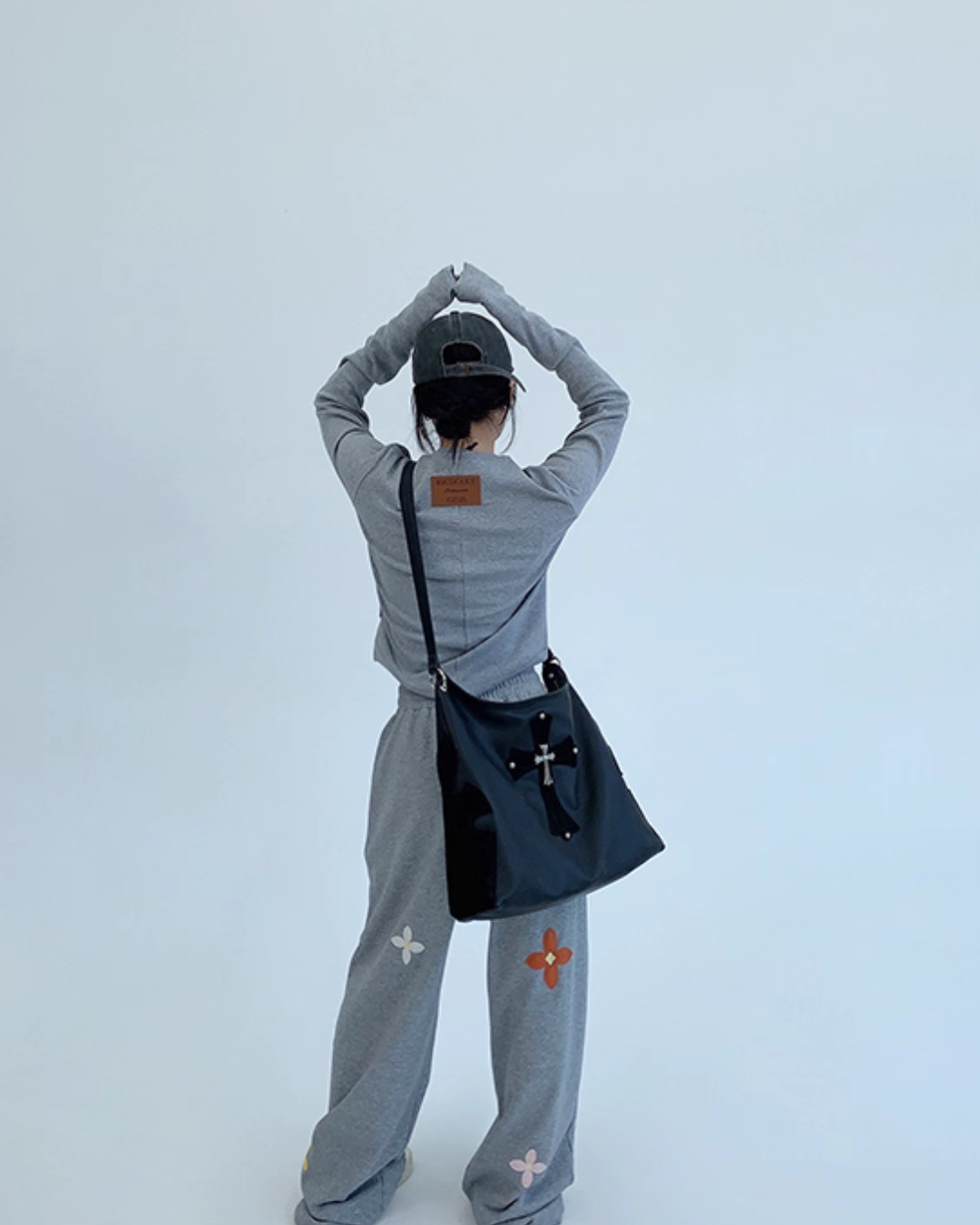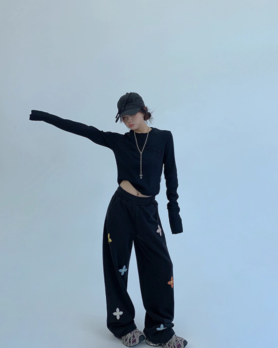 花のワッペンが女子感を演出できるスウェットパンツ。